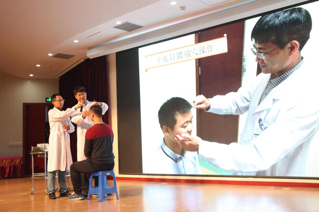 三附院康复科主任胡斌正在展示平衡针技术