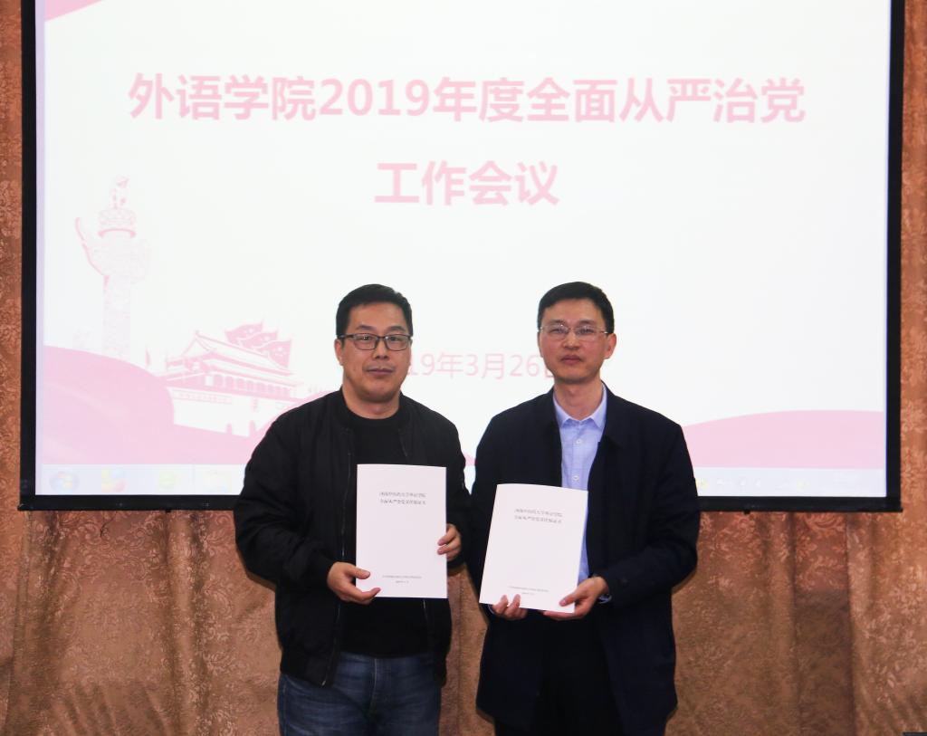 段其波对2018年度全面从严治党、党风廉政建设工作进行了全面总结,指出了工作中存在的问题和不足,安排部署了2019年的重点工作任务,他要求广大教职工要进一步统一思想,提升政治站位,持续加强政治理论学习,狠抓全面从严治党责任落实,营造风清气正的政治生态,推动外语学院内涵建设,为学校转型发展作出应有贡献。各科室主任、支部书记向段其波递交了《全面从严治党责任书》。
