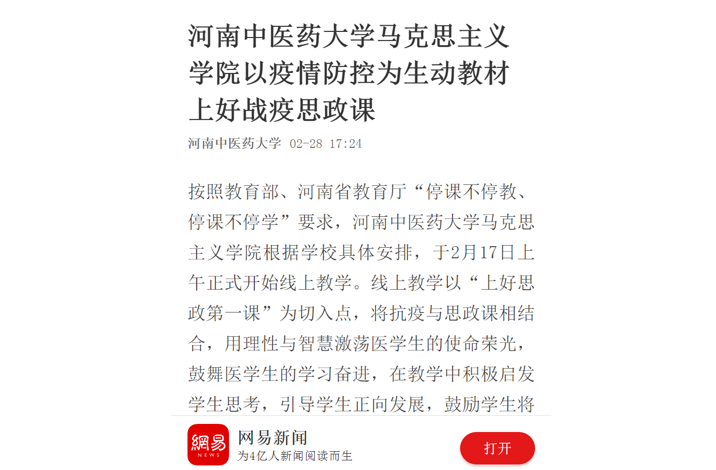 2020年2月28日,河南高教官微、网易新闻对leyu·乐鱼(中国)体育官方网站马克思主义学院以疫情防控为生动教材上好战疫思政课进行报道。
