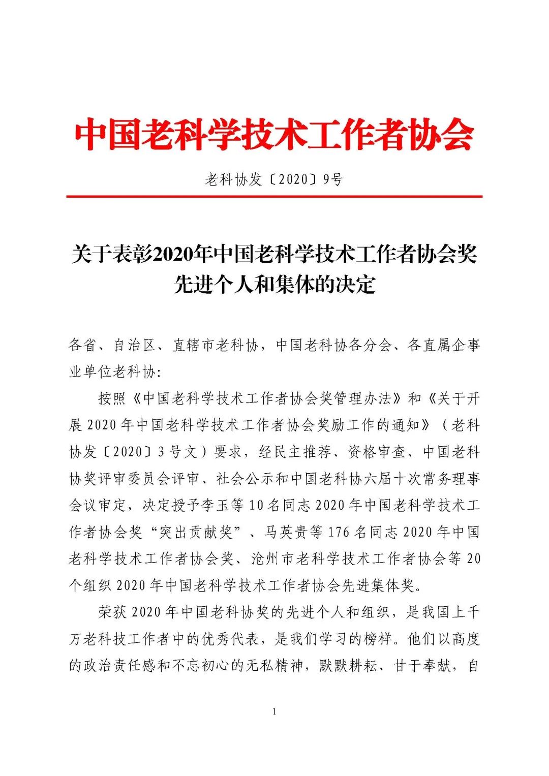 中国老科学技术工作者协会表彰文件