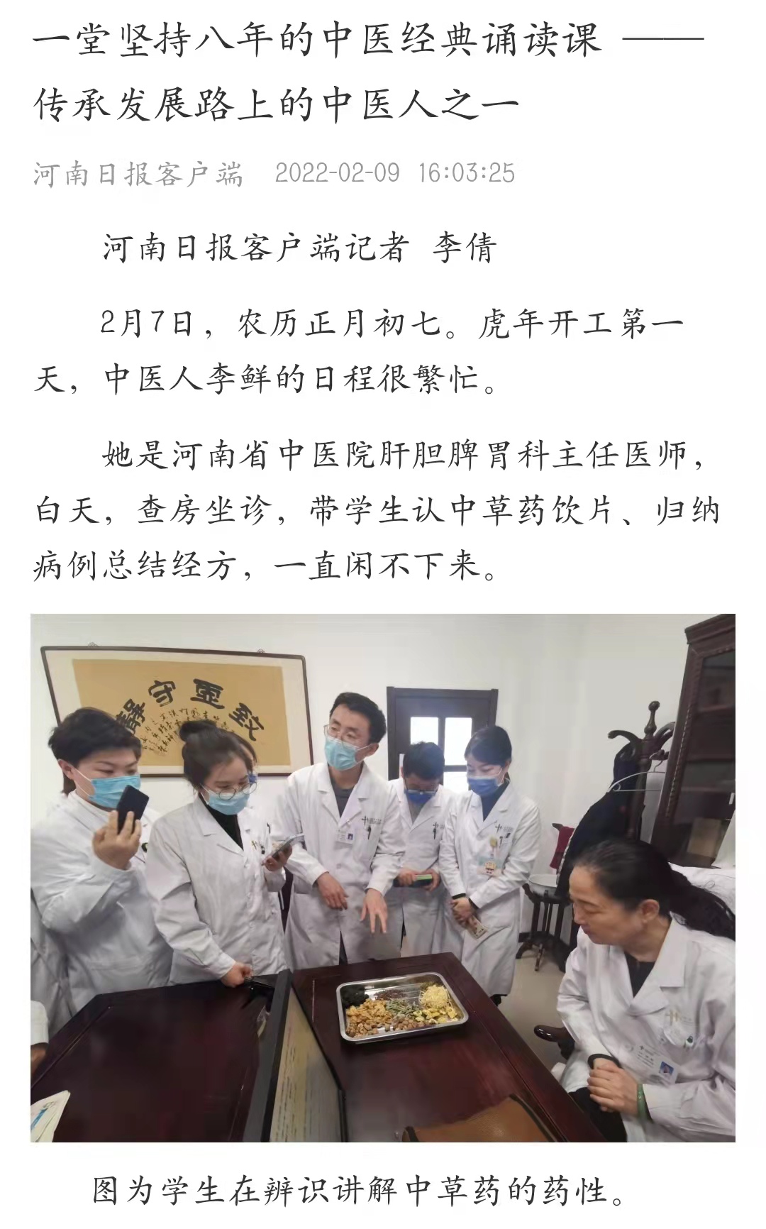 2022年2月9日,河南日报客户端以《一堂坚持八年的中医经典诵读课——传承发展路上的中医人之一》为题,对二附院肝胆脾胃科主任医师李鲜的事迹进行报道。
