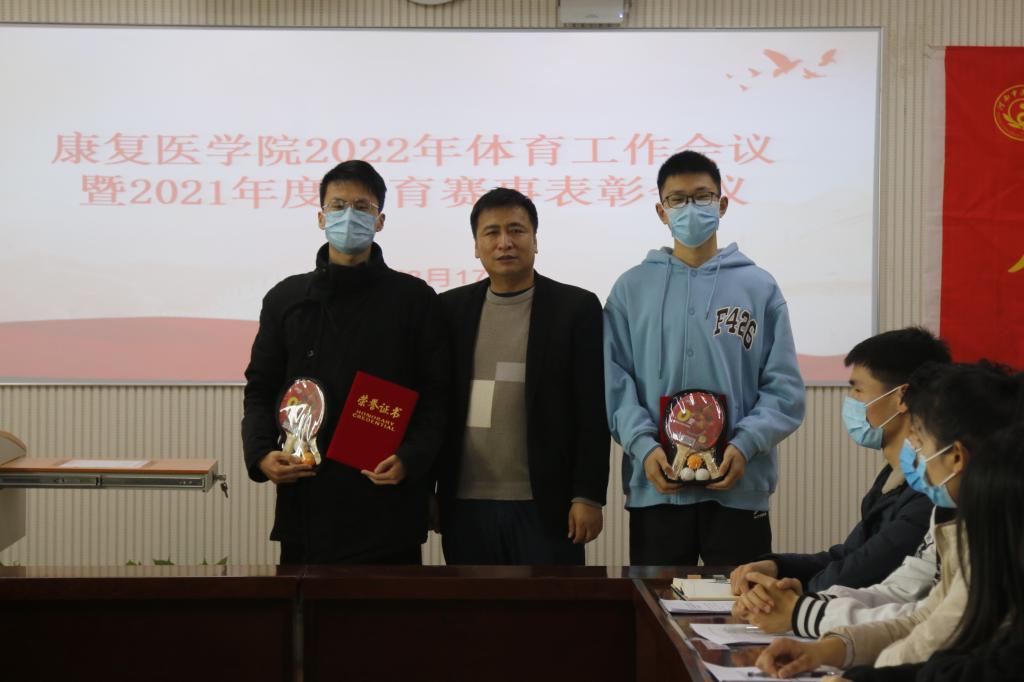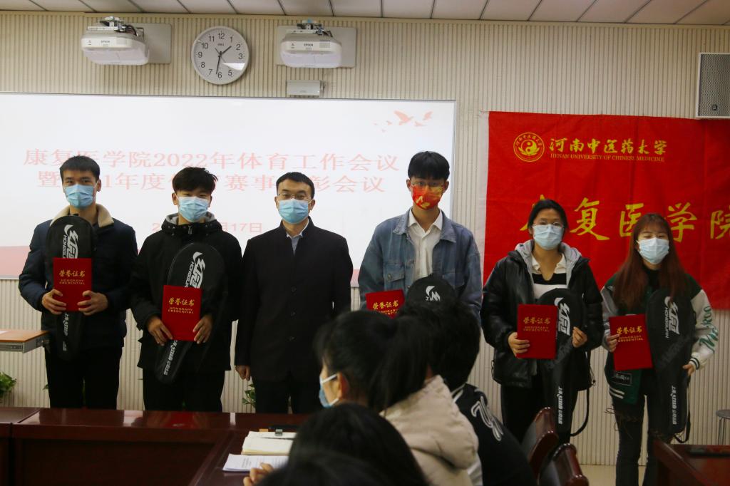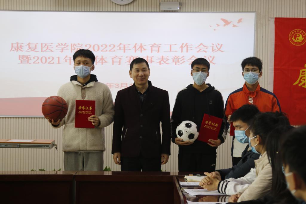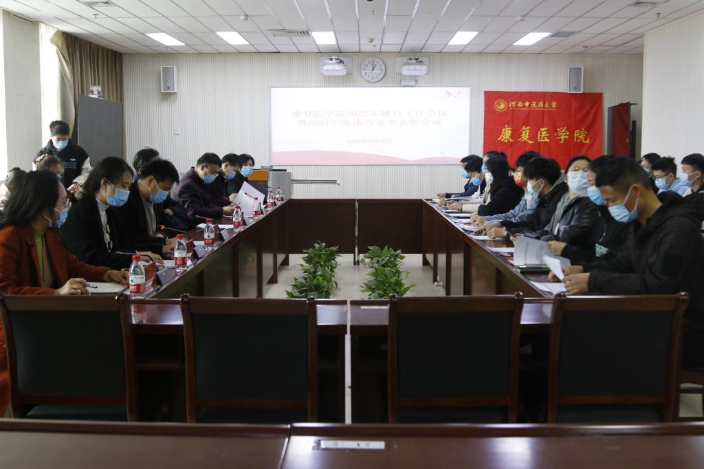 本网讯(文/张瑞雪 图/陈宁)体育强则中国强,国运兴则体育兴。为深入学习习近平总书记关于体育工作重要讲话精神,深入贯彻落实学校体育工作会议要求,扎实开展“能力作风建设年”活动,2022年3月17日中午1点,康复医学院召开2022年体育工作会议,学习学校体育工作会议精神,并对2021年度体育赛事先进个人和集体进行表彰。康复医学院领导班子、辅导员、各班班长、体育委员、学生会主席团成员、体育部部长、副部长及运动员代表参加此次会议,会议由学院辅导员张瑞雪主持。