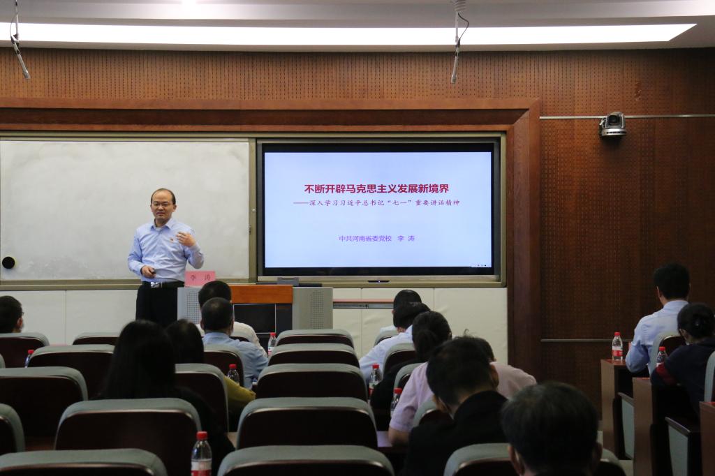 李涛副教授以《不断开辟马克思主义发展新境界——深入学习习近平总书记“七一”重要讲话精神》为题,从深刻把握习近平总书记“七一”重要讲话的重大意义、马克思主义理论谱系的最新成果、系统回答新时代根本问题、系统破解新时代实践难题、传承弘扬中华优秀传统文化等5个方面,深刻阐述和系统讲解了习近平总书记“七一”重要讲话的意义、主要内容和丰富内涵,深入解读了在新征程上以史为鉴、开创未来的根本要求,同时围绕讲话中提出的一系列新思想新观点新要求进行了系统阐释。讲座思想深刻,内容翔实,既有理论高度、又有思想深度,使全体教师对习近平总书记“七一”重要讲话精神有了更为全面深刻的理解和认识。