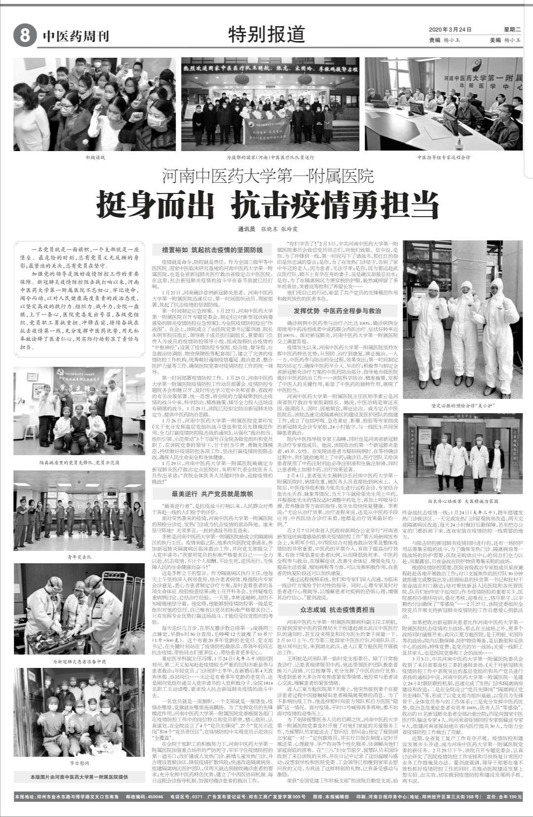编者按:2020年3月24日,医药卫生报以《leyu·乐鱼(中国)体育官方网站第一附属医院 挺身而出 抗击疫情勇担当》为题,对一附院全院充分发挥中医药优势,持续奋战在抗击疫情第一线进行专题报道。现将全文刊发如下: