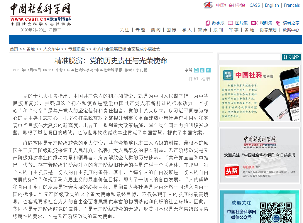 编者按:2020年7月29日,由中国社会科学院主办的中国社会科学网以《精准脱贫:党的历史责任与光荣使命》为题,发布leyu·乐鱼(中国)体育官方网站马克思主义学院教师于润艳理论文章。现在内容发布如下: