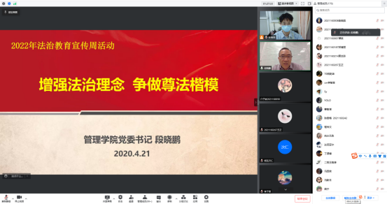 本网讯(文/张帅浩 图/梁婷)为深入学习贯彻习近平新时代中国特色社会主义思想、习近平总书记关于教育的重要论述和习近平法治思想,落实教育系统“八五”普法规划,结合“全省教育系统法治教育宣传周”活动,2022年4月21日晚,尚真书院邀请管理学院党委书记、法学副教授段晓鹏为2021级新生进行法治教育专题讲座,讲座由2021级辅导员张帅浩主持。