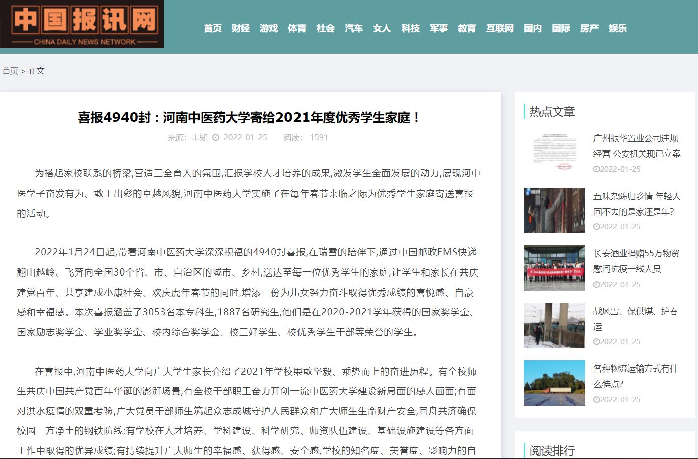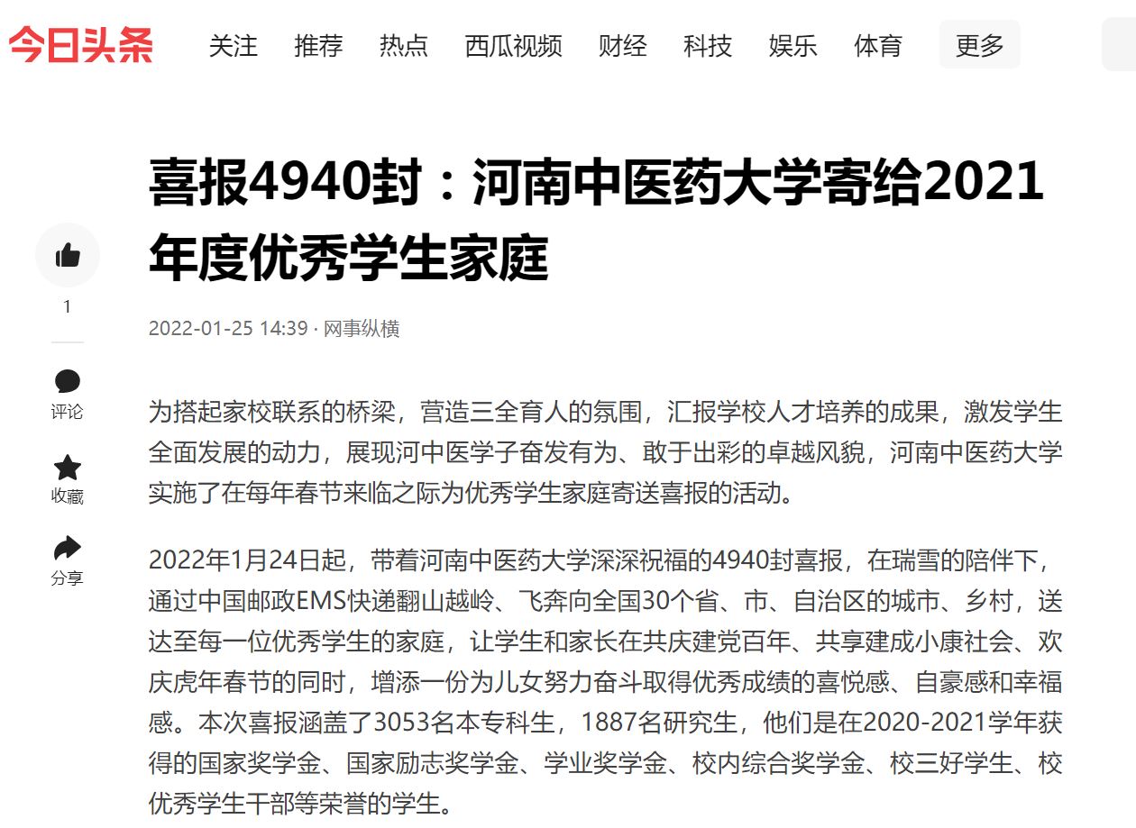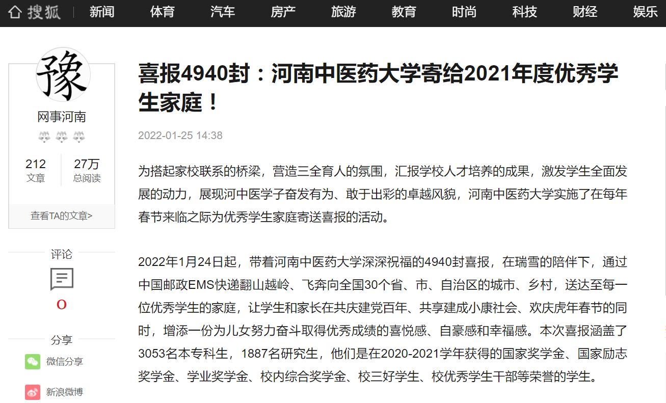 编者按:2022年1月25日,中国资讯网、中国信息网、中国报讯网、河南日报客户端、前途中国、中国梦网、创业中国、经典中国、中国侨报网、中国网讯、搜狐新闻、今日头条、企鹅号、百家号、一点号、中国前沿观察网等多家媒体对leyu·乐鱼(中国)体育官方网站为4940个2021年度优秀学生家庭寄送喜报进行报道。