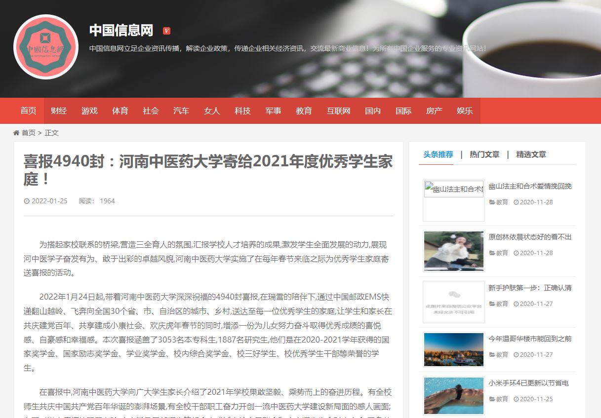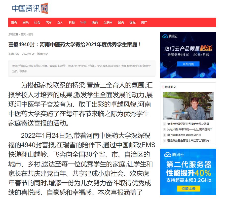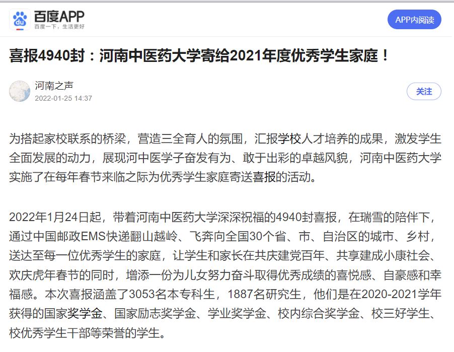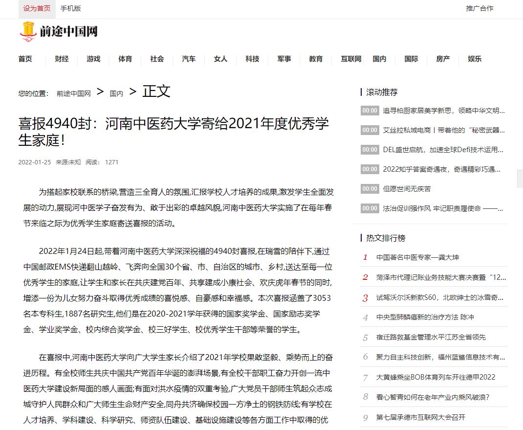 编者按:2022年1月25日,中国资讯网、中国信息网、中国报讯网、河南日报客户端、前途中国、中国梦网、创业中国、经典中国、中国侨报网、中国网讯、搜狐新闻、今日头条、企鹅号、百家号、一点号、中国前沿观察网等多家媒体对leyu·乐鱼(中国)体育官方网站为4940个2021年度优秀学生家庭寄送喜报进行报道。
