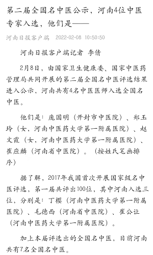 编者按:2月8日,由国家卫生健康委、国家中医药管理局共同开展的第二届全国名中医评选结果进入公示,河南共有4名中医医师当选全国名中医,二附院院长崔应麟主任医师名列其中,荣获“全国名中医”称号,现将河南日报客户端原文刊载如下: