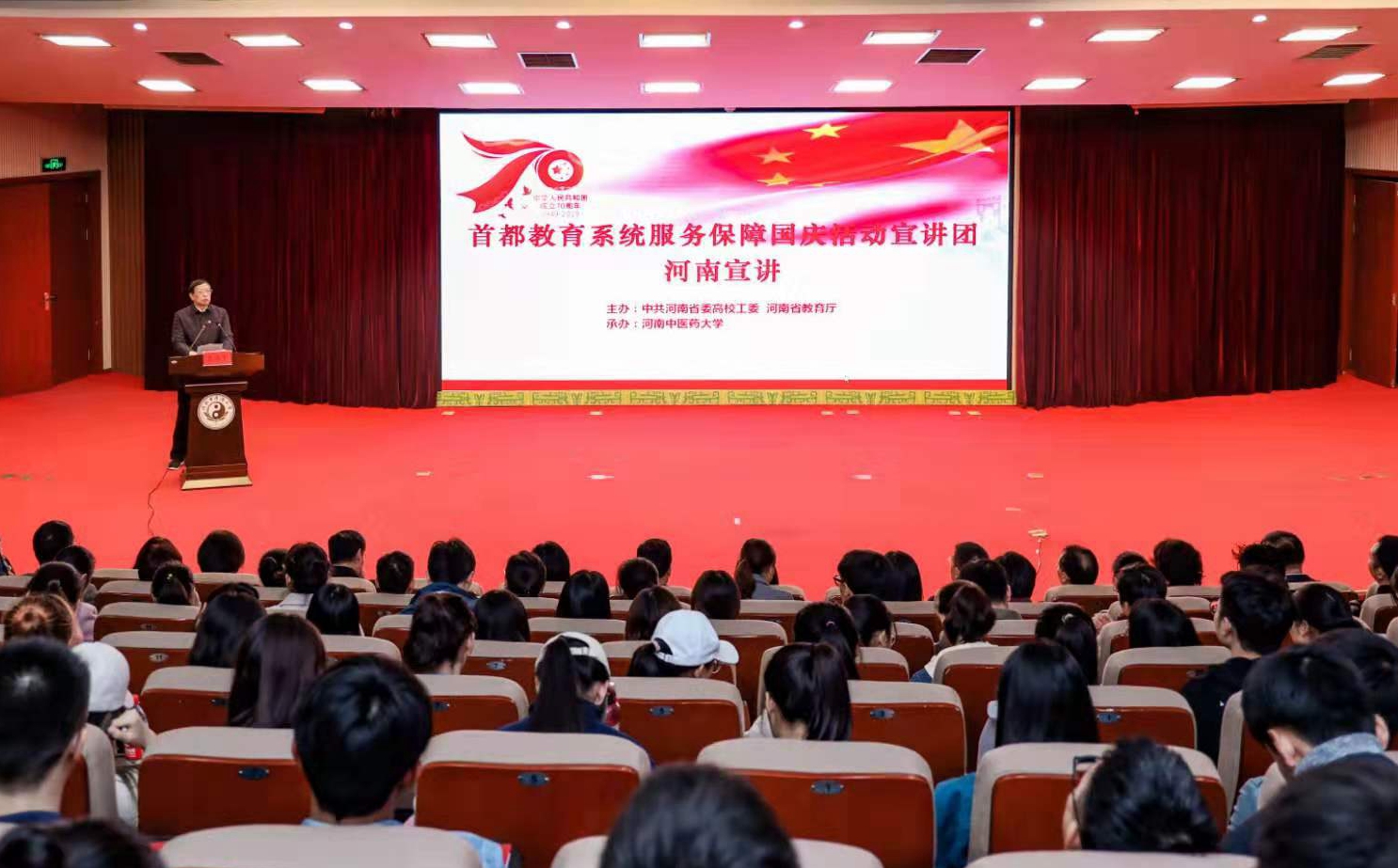 在全体师生奏唱的国歌声拉开了报告会序幕。高治军代表省委高校工委、省教育厅在致辞中对宣讲团一行的到来表示热烈欢迎和衷心感谢。他表示,习近平总书记在听取新中国70周年庆祝活动总结报告时强调,“庆祝活动为我们留下了十分宝贵的精神财富,要加强对这些精神财富的发掘利用,使之转化为亿万人民群众奋进新时代的强大动力”。教育部签署了嘉奖令,号召全国教育系统向参与活动的首都高校及各类学校的师生学习。高治军指出,此次宣讲活动的开展是教育部学习贯彻落实习近平总书记重要讲话精神的一次实际行动,充分体现了教育部党组对河南高校的高度重视和对广大师生的深切关怀,他希望广大师生要深入贯彻落实总书记的重要指示精神,以此次宣讲活动为契机,共同学习传播国庆庆祝活动留下的宝贵精神财富,持续推动爱国主义教育走深、走实,切实把庆祝活动形成的宝贵精神财富更好地转化为立德树人、教育报国的实际行动,进一步把爱国主义教育做深做实,将爱国情、强国志、报国行贯通起来,努力培养担当民族复兴大任的时代新人,共同为实现“两个一百年”奋斗目标和中华民族伟大复兴的中国梦而不懈奋斗,在为实现中原更加出彩的新征程上作出更大贡献。