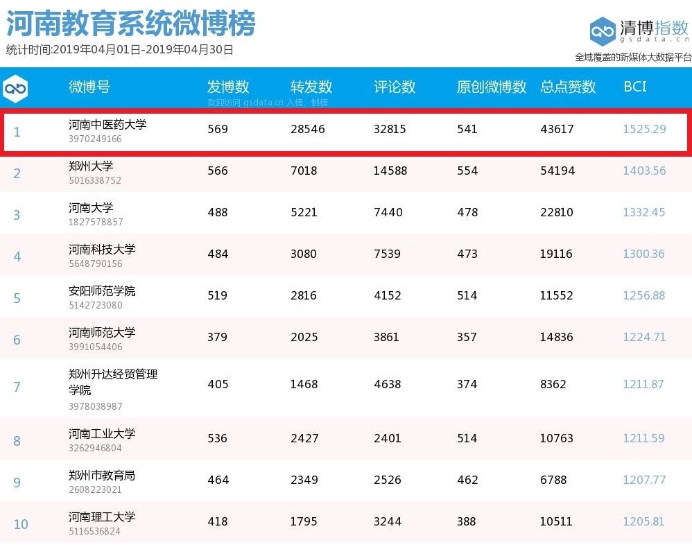 本网讯(文图/秦元刚)近日,根据清博大数据发布的新媒体最新统计数据,2019年4月1日至4月30日,leyu·乐鱼(中国)体育官方网站官方微博发博数569,转发数28546,评论数32815,原创微博数541,总点赞数43617,浏览量达1000万余人次,BCI指数1525.29,位居“河南教育系统微博榜”“河南省本科高校微博榜”双榜首。