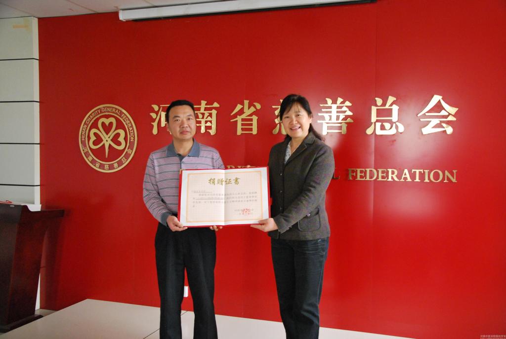 5月9日上午,学校工会副主席曹蕴俐和工会相关工作人员,带着全校师生员工的一份爱心,一份祝福,一份情谊,一份希望,为四川雅安地震灾区的捐款258424.59元,来到了河南省慈善总会办理了交接手续,并询问了款项的用途,领取了集体、个人捐款证书。