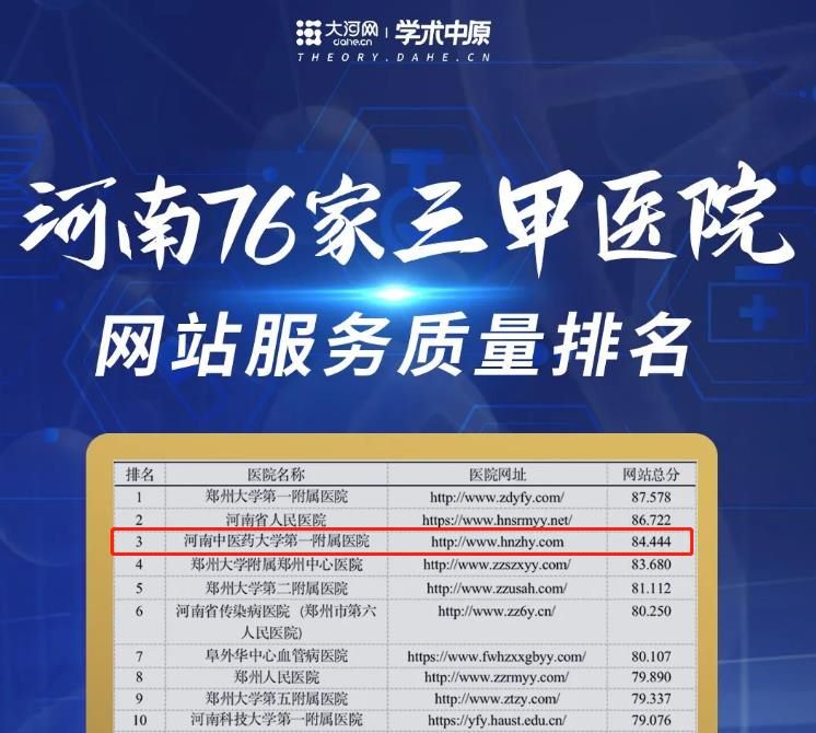 此次评价排名是大河网大河智库·智慧医疗研究院研究团队历时三个多月,通过多维度多参数研究,全方位对河南省76家三甲医院门户网站进行测评,形成了《河南省三甲医院门户网站评价报告》。报告从产品质量和服务质量两方面着手,经过专业人士评价和用户体验测评,涵盖10个一级指标、28个二级指标,56个三级指标。报告包括河南省三甲医院网站服务质量的评估结果,包括医院网站名称、网址、网站总分与排名。