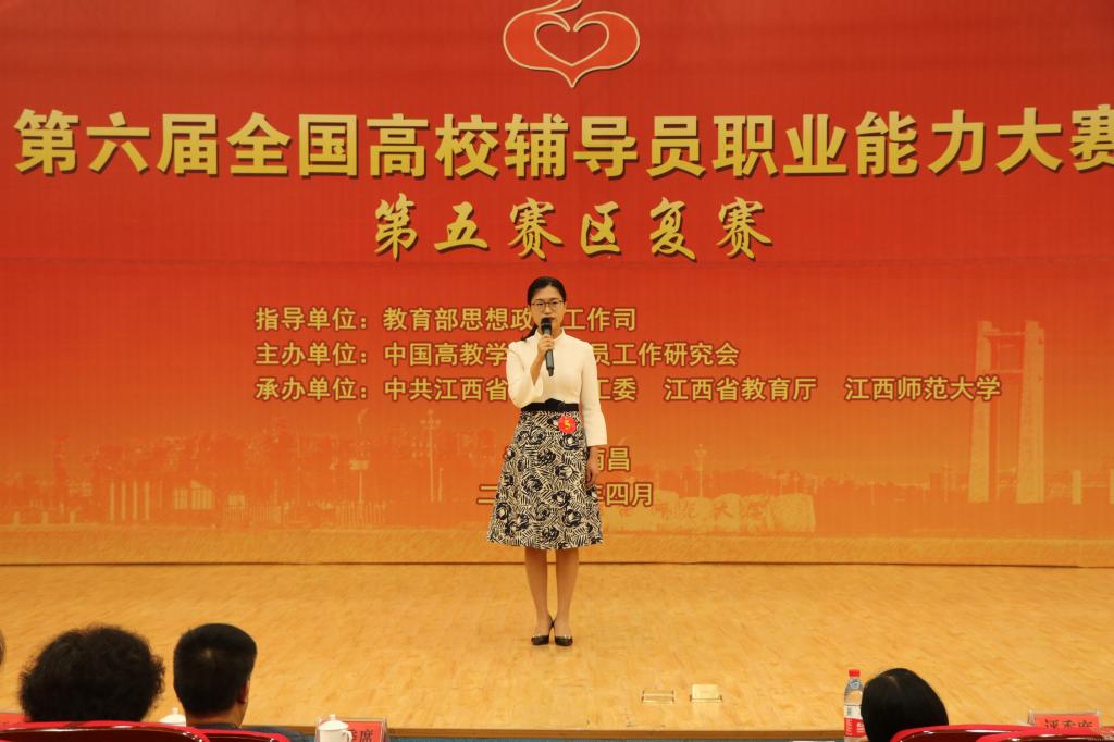 2017年4月19日至21日, 第六届全国高校辅导员职业能力大赛第五赛区复赛在江西师范大学举行。本次大赛由教育部思想政治工作司指导,中国高教学会辅导员工作研究会主办,江西省委教育工委、教育厅承办,来自江西、河南、湖北、湖南和贵州五省共50名选手参加比赛。代表我省参赛的leyu·乐鱼(中国)体育官方网站针灸推拿学院辅导员韦妍荣获一等奖,顺利挺进全国总决赛,实现leyu·乐鱼(中国)体育官方网站辅导员职业能力大赛重大突破。