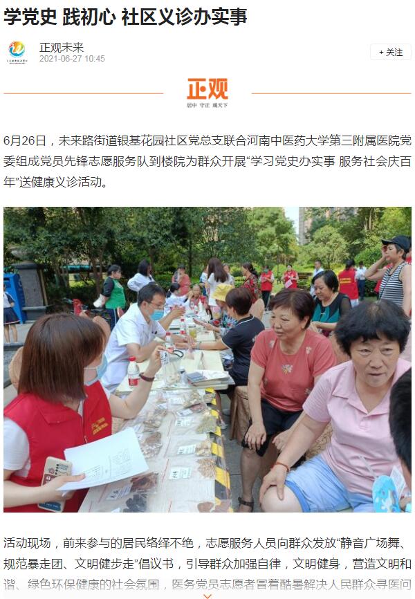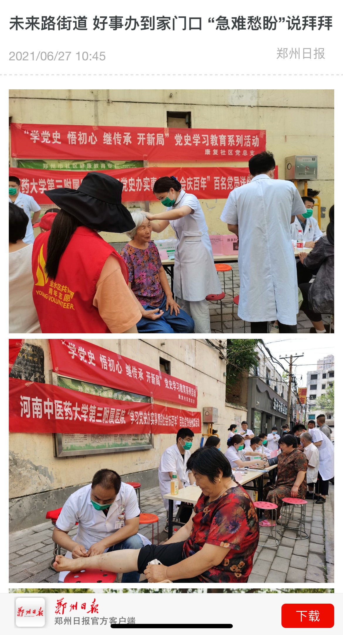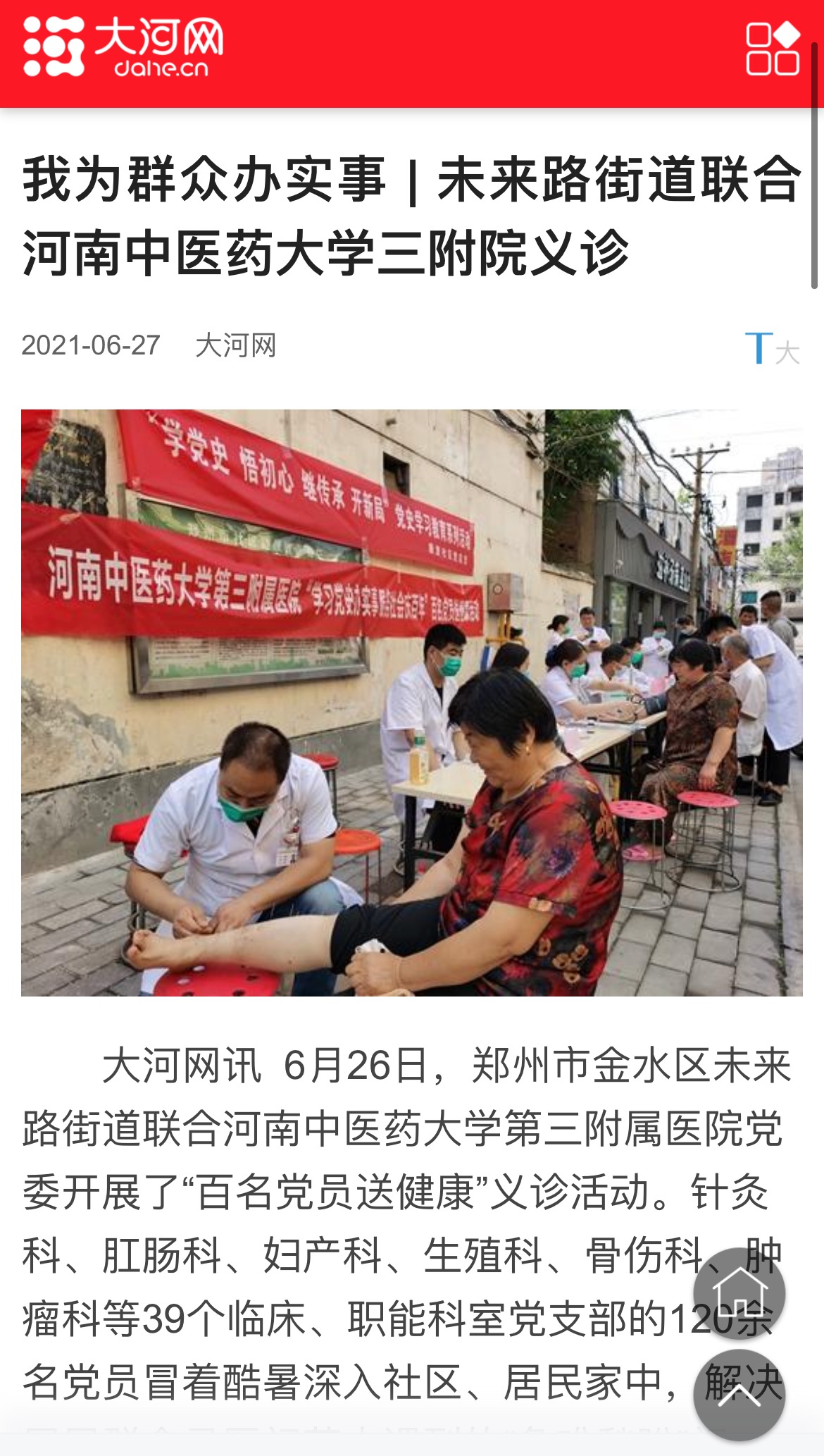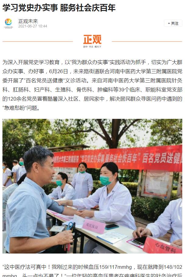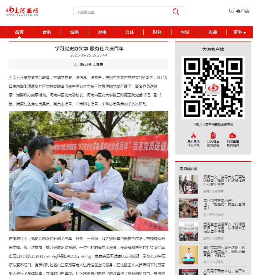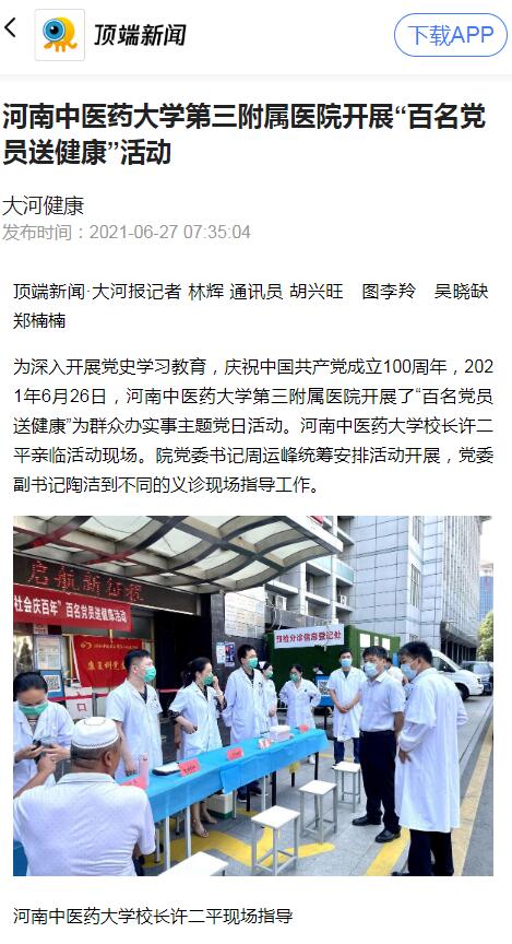 编者按:2021年6月27日,河南日报客户端、郑州日报官方客户端、大河网、大河报网、顶端新闻、正观未来等多家媒体对三附院“百名党员送健康”为群众办实事主题党日活动进行报道。