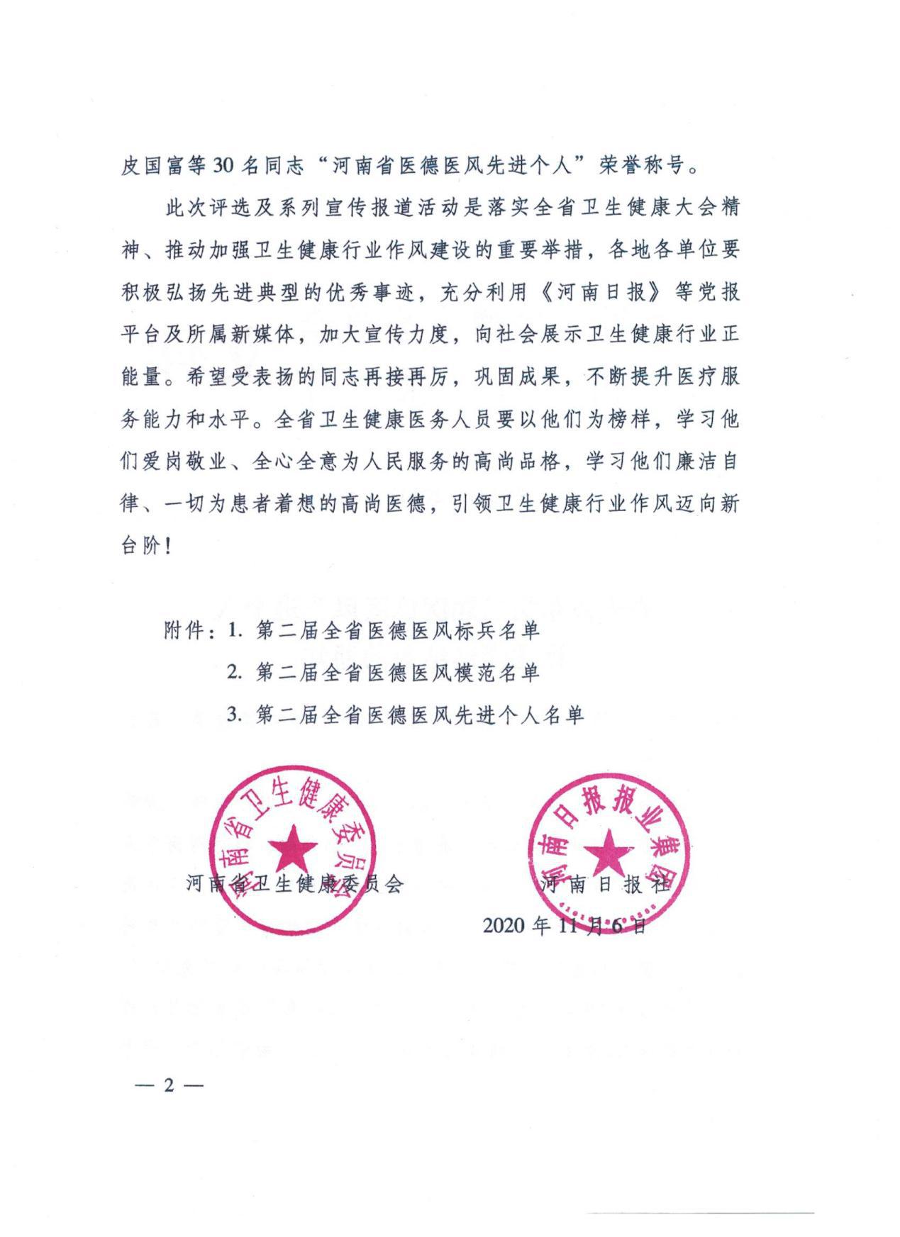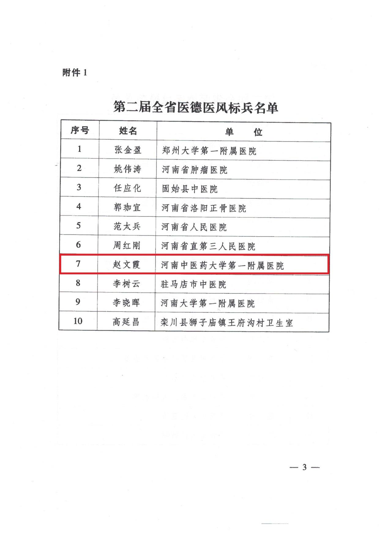 本网讯(文/张芳 图/张艳云)近日,河南省卫生健康委发布《关于公布第二届医德医风先进个人评选活动结果的通知》,一附院赵文霞教授通过组织推介、专家评审、网络投票等环节的层层选拔,经第二届医德医风先进个人评选活动领导小组研究决定,获得“河南省医德医风标兵”荣誉称号。