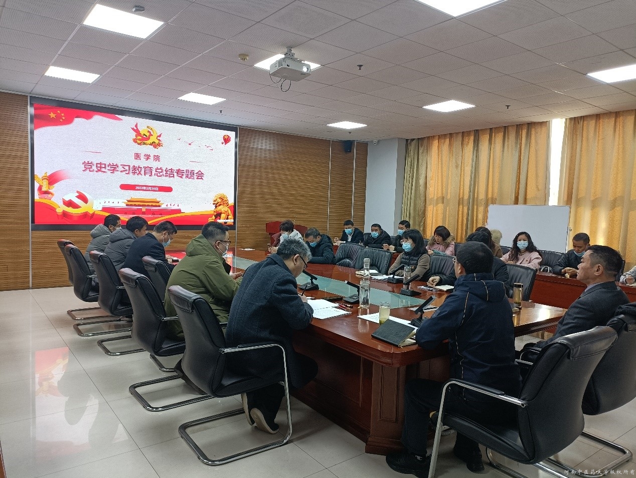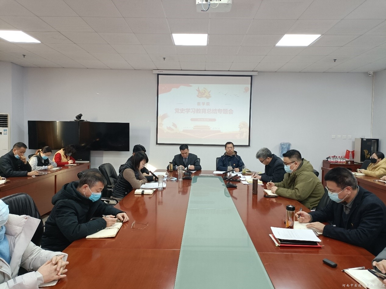 本网讯(文/王坦 图/荣文慧)2022年2月20日,医学院在教学实验大楼A447会议室召开党史学习教育总结会。医学院领导班子成员、各科室主任、副主任、支部书记参会。会议由医学院党委书记高剑峰主持。