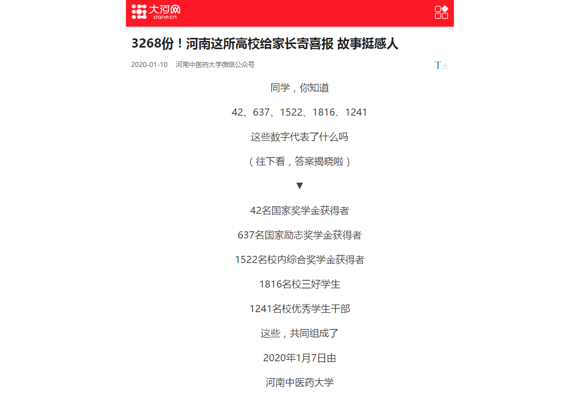 据悉,这3268份喜报包括,42份国家奖学金喜报,637份国家励志奖学金喜报,1522份校内综合奖学金喜报,1816份校三好学生喜报和1241份校优秀学生干部喜报。