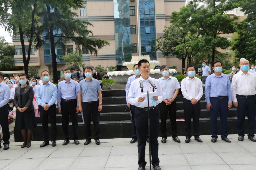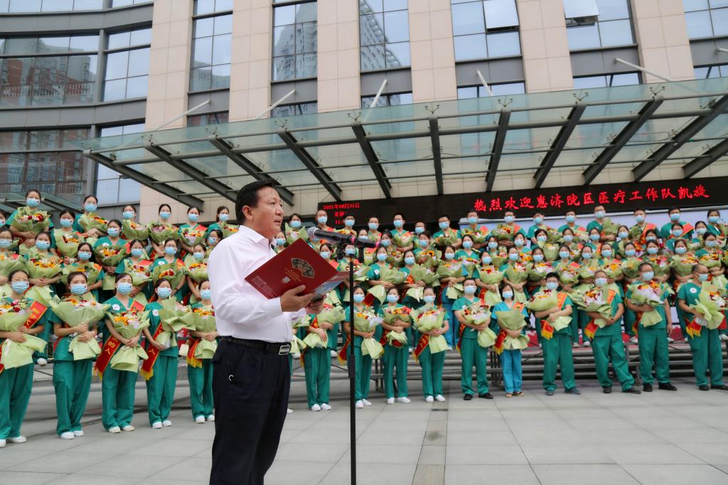 医院党委为医疗队队员们举行了简朴隆重的欢迎仪式。河南省卫健委中医处处长姬淅伟、校党委书记别荣海、校长许二平等领导出席活动。一附院党委书记翟剑波、院长朱明军等全体在郑院领导,各相关职能及临床科室主任、护士长代表,医疗队家属代表参加了仪式。仪式由朱明军主持。