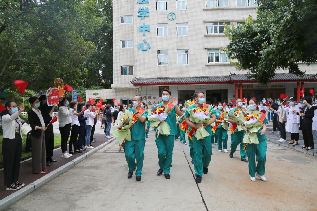 2021年8月31日上午10点40分,伴随着热烈的掌声,满载着146名英雄的车队缓缓驶入一附院。参会领导列队在医院“仲景广场”迎接,翘首等待的一附院职工代表、家属代表举着欢迎标语牌,舞动手中的红旗,欢呼着迎接队员们凯旋。现场领导为队员们颁授“最美逆行者”绶带,向英雄们致以崇高的敬意。