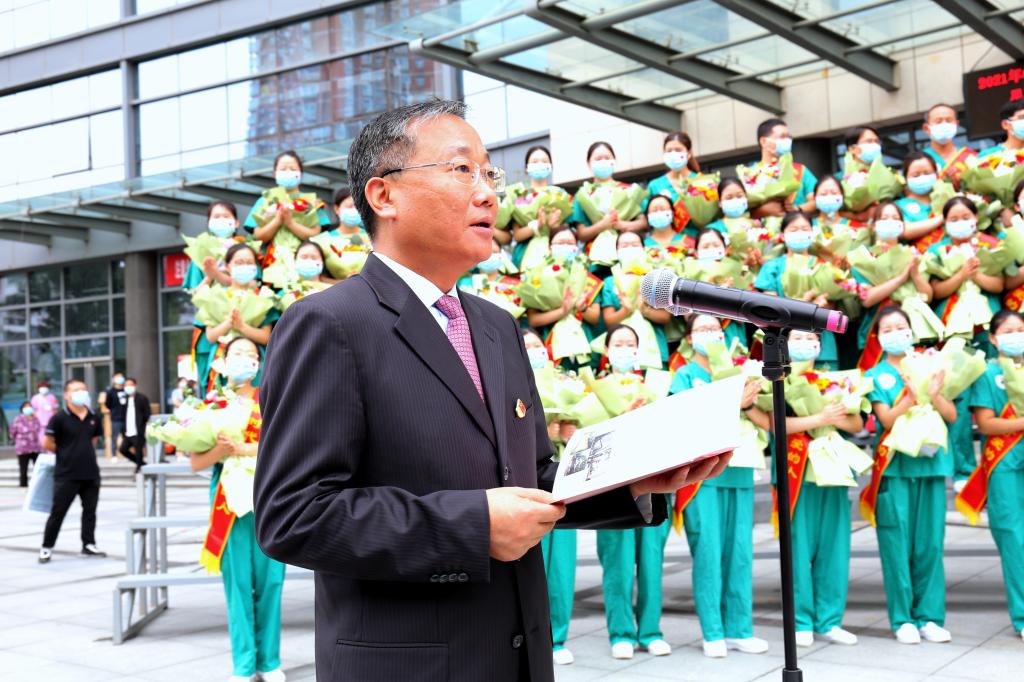 朱明军在仪式结束时再次向出征定点医院的146位英雄表达了感谢。他表示,希望大家放松心情、好好休息,尽快调整好身心状态回归岗位,以更加饱满的精神状态和工作热情为医院建设发展,为传承发展中医药事业再创佳绩,再立新功。