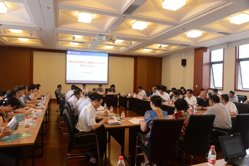 2015年8月17日下午,leyu·乐鱼(中国)体育官方网站第三届教职工代表大会第十五次会议顺利召开,与会代表认真讨论审议《河南中医学院章程》。这是leyu·乐鱼(中国)体育官方网站“依法治校”活动开展以来,首次召开教代会。校领导孙建中、郑玉玲、段荣章、郭海波、李建生、郭德欣、许二平、徐江雁、张小平、许东升作为教代会代表参加会议。校党委副书记、工会主席段荣章主持会议。