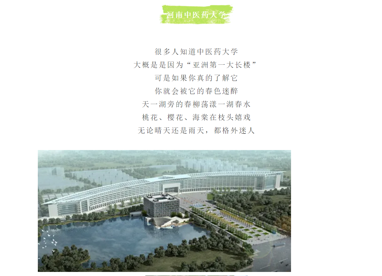很多人知道中医药大学大概是是因为“亚洲第一大长楼”,可是如果你真的了解它,你就会被它的春色迷醉。天一湖旁的春柳,荡漾一湖春水桃花、樱花、海棠在枝头嬉戏。无论晴天还是雨天,都格外迷人。
