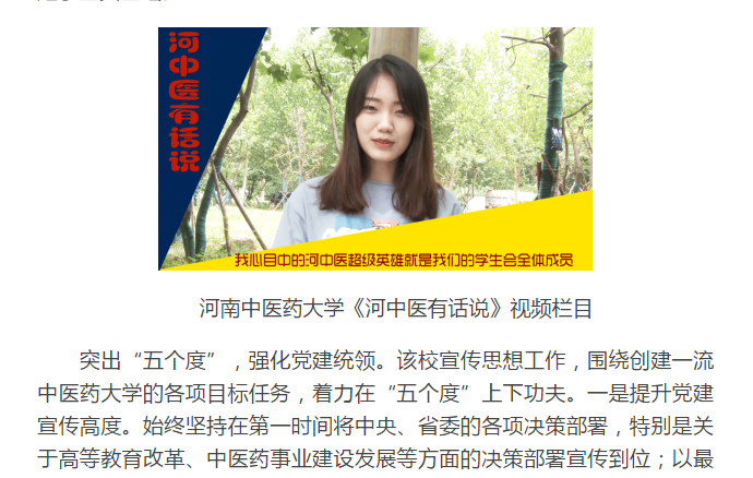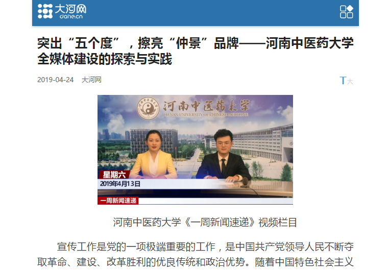 突出“五个度”,强化党建统领。该校宣传思想工作,围绕创建一流中医药大学的各项目标任务,着力在“五个度”上下功夫。一是提升党建宣传高度。始终坚持在第一时间将中央、省委的各项决策部署,特别是关于高等教育改革、中医药事业建设发展等方面的决策部署宣传到位;以最快速度将学校党委关于推进全面从严治党出台的各项制度,召开的重要会议,举办的培训交流,采取的各项举措、取得的成效等宣传到位。以2018年为例,全年发布有关党的建设新闻稿近200篇,占学校全年发稿量的20%。始终坚持用广大师生喜闻乐见、充满正能量、能形成共识的“干货”占领主流思想舆论阵地,让党的声音传得更开、传得更广、传得更深入。二是提升外宣工作广度。以2018年为例,光明日报、教育报,中国中医药报,河南日报,大河网等外媒报道leyu·乐鱼(中国)体育官方网站稿件300余篇,比2017年同比增长51%,提升了学校的知名度和影响力。三是提升内涵建设宣传的深度。2018年,学校在内涵建设方面集中发力,重拳出击,在人才培养、学科建设、科学研究、师资队伍建设等方面均迈上了新台阶,全年发布内涵建设稿件近500篇,占全年发稿量的42%。四是提升展示师生风采的亮度。为进一步提振精神,鼓舞士气,2018年共采访、宣传干部师生先进事迹共400余人次,充分展示了广大师生的靓丽风采。五是提升宣传矩阵打造的力度。通过出台系列规章制度,改版学校网页和校报,增设显示屏,整合新媒体平台,加强培训交流等,打造了全新的全校新媒体联盟,壮大了主流思想舆论阵地,构建了大宣传格局。