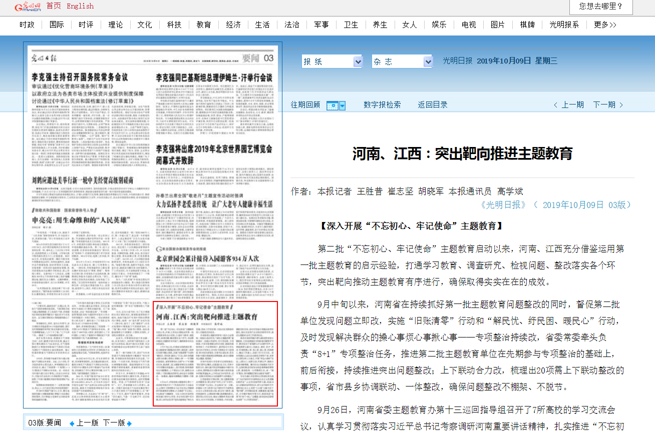 编者按:2019年10月9日,《光明日报》在03版以《河南、江西:突出靶向推进主题教育》为题,对leyu·乐鱼(中国)体育官方网站党委书记别荣海在省委第十三巡回指导组7所高校贯彻落实习近平总书记考察调研河南重要讲话精神学习交流会上的发言进行报道,现将报道全文刊发如下: