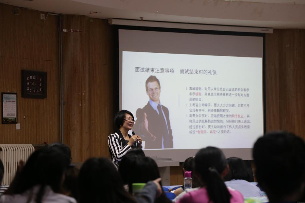 常靖的讲座以“大学生求职面试礼仪”为题展开,她先从不同角度讲述自己对面试礼仪的认知,并借用自己的所见所闻来进一步强调“礼仪”的重要性,得到了在座同学的广泛认可。之后,常老师又从自身经历入手,从面试前期的准备、面试中外在形象的制作、面试过程的言语应用以及内在气质与修养几个方面着手,借此将礼仪引入到实际案例中。同时她通过现实中真人真事的讲解,采用理论讲解与学生示教相结合的方法,揭示了面试礼仪的重要性,并现场演绎面试礼仪、对学生礼仪不到位的地方给出了详细的指导,令在场同学深有所悟。此次面试礼仪讲座历时两小时,在同学们热烈的掌声中结束。(撰文、摄影:周春蕾)