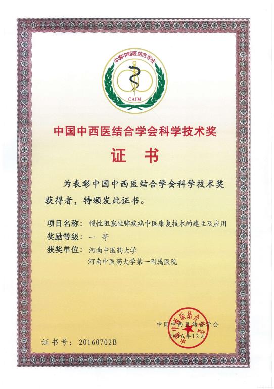 获中国中西医结合学会科学技术进步奖一等奖