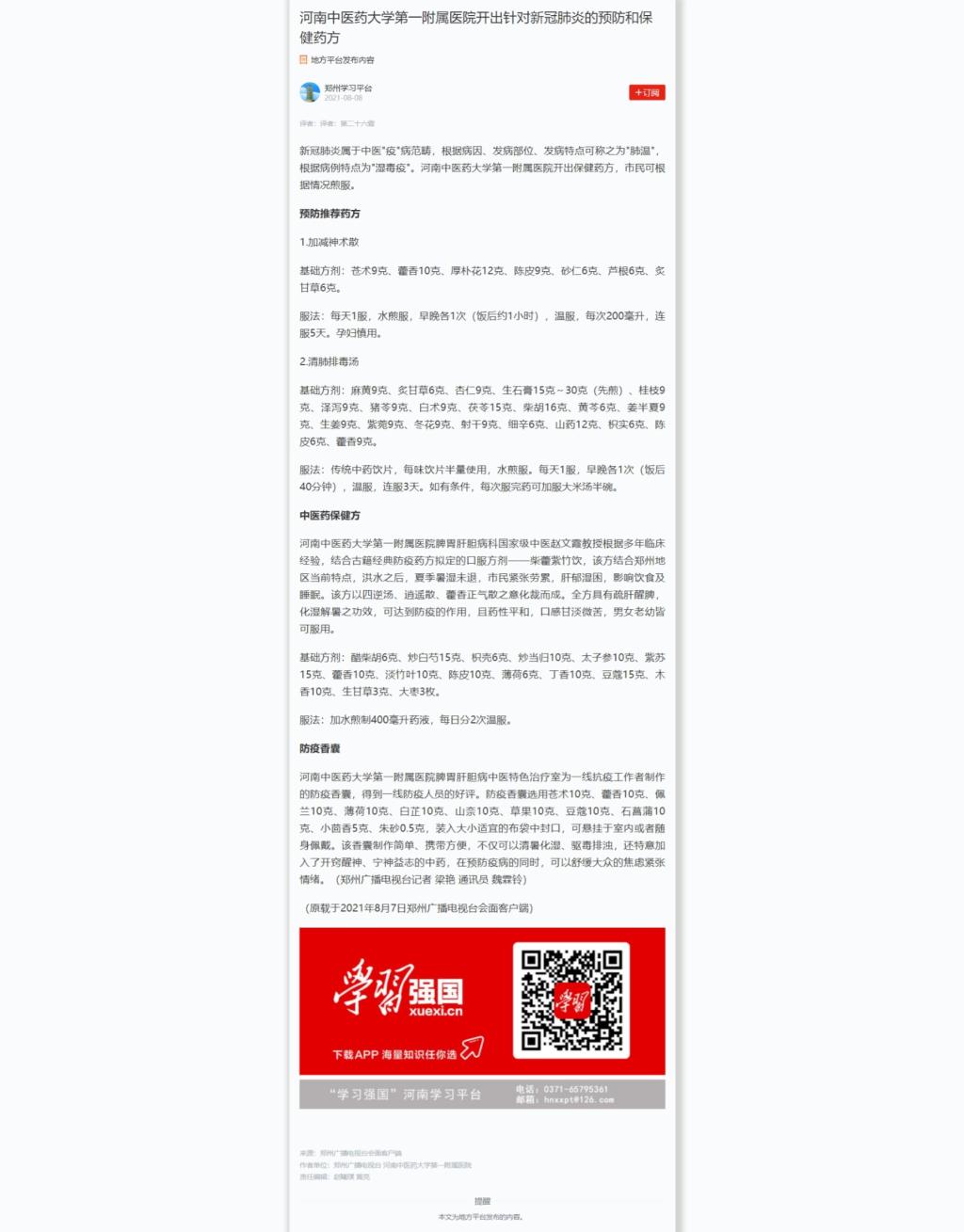编者按:2021年8月13日,学习强国对一附院开出的针对新冠肺炎的预防和保健药方进行报道,现将全文刊发如下: