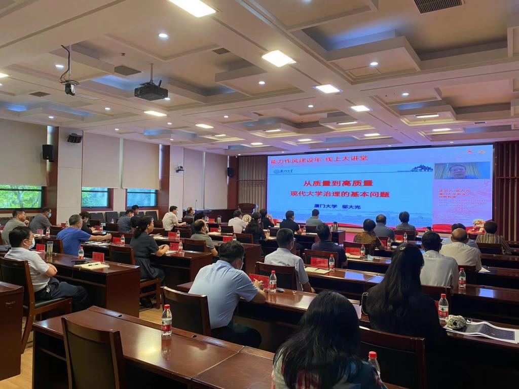 本网讯(文/图 孟复)2022年8月24日上午,学校在郑领导班子成员、部分中层领导干部在图书馆第二报告厅参加了河南省高校“能力作风建设年·线上大讲堂”活动第5期专题培训,特邀厦门大学南强特聘教授、厦门大学原副校长、中国高等教育学会副会长、教育部高等学校专业设置与教学指导委员会副主任、全国高等院校质量保障联盟理事长邬大光围绕“现代大学治理”做专题辅导,省委教育工委专职委员何秀敏主持会议。