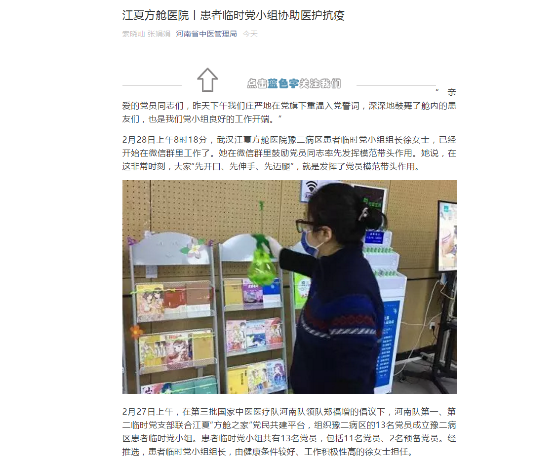 为发挥党员患者的积极性,充分发挥党支部、党小组的战斗堡垒作用,2月27日上午,在河南省中医院、江夏方舱医院副院长郑福增的指导下,江夏方舱医院豫二病区河南队的两个临时党支部组织病区内党员患者成立了患者临时党小组。这个党小组共有党员13名,其中正式党员11名,预备党员2名,健康条件较好、工作积极性高的徐女士被选任为临时党小组组长。