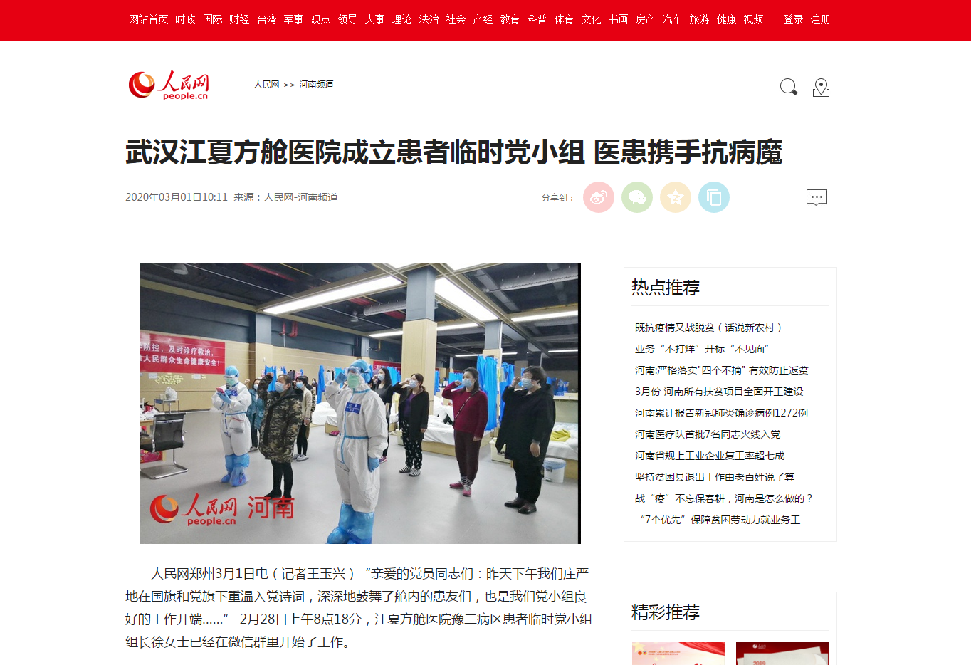 编者按:2020年3月1日-2日,人民网、河南省中医管理局官微对leyu·乐鱼(中国)体育官方网站在方舱医院成立豫二病区患者临时党小组进行报道。现将全文刊发如下: