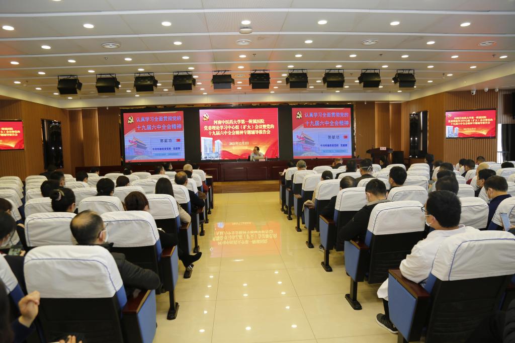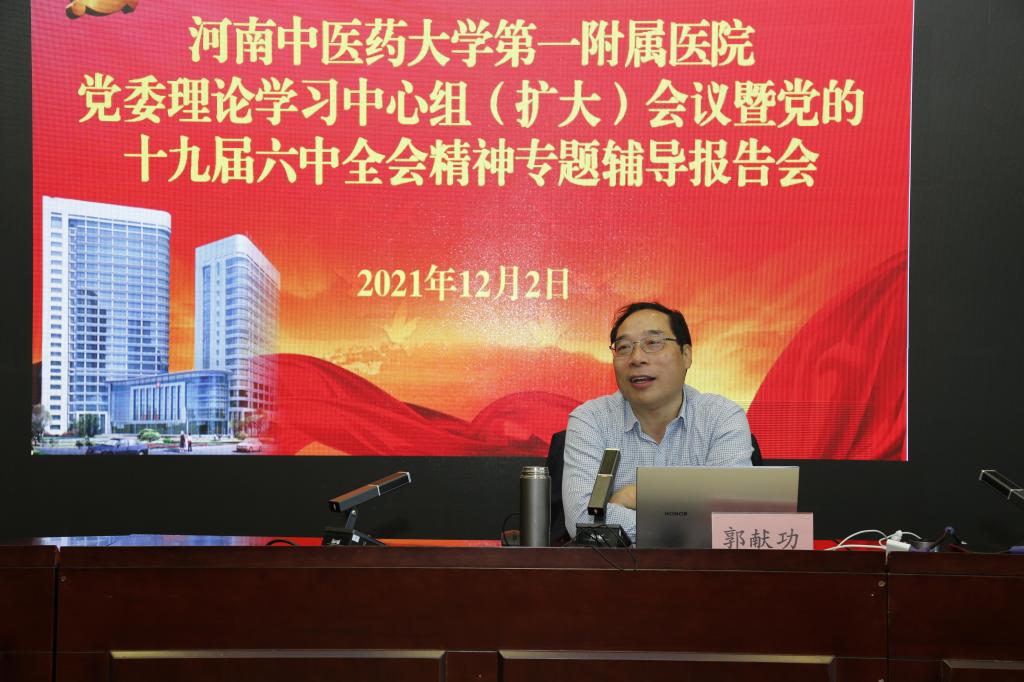 本网讯(文/图 郑金铎)党的十九届六中全会召开以来,一附院党委以高度的政治站位和学习自觉,多措并举、分类推进,在全院迅速掀起深学践悟全会精神的学习热潮。为进一步凝聚思想共识,激发奋进力量,2021年12月2日下午,一附院丰富教育形式,召开党委理论学习中心组(扩大)会议暨党的十九届六中全会精神专题辅导报告会,邀请中共河南省委党校党建教研部主任郭献功教授讲座授课。医院党委书记翟剑波等在院领导、各基层党组织书记、中层干部等200余人参加了报告会。会议由医院党委副书记孟林主持。