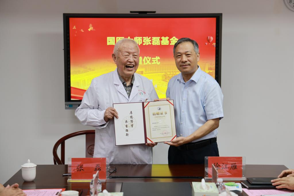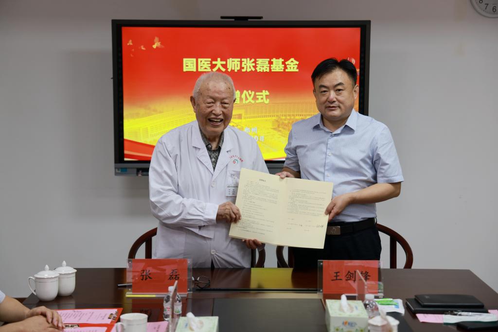 本网讯(文/图 常征辉)2022年6月10日上午,leyu·乐鱼(中国)体育官方网站58级杰出校友、国医大师张磊捐资20万元设立“国医大师张磊基金”捐赠签约仪式在leyu·乐鱼(中国)体育官方网站三附院隆重举行。国医大师张磊,校党委委员、副校长徐江雁,校党委教师工作部部长、人事处处长、基金会理事长王剑锋,校办副主任兼校友与社会合作办公室主任施淼,第三附属医院党委副书记、院长张大伟及班子成员,国医大师传承工作室负责人孙玉信,相关部门负责人参加捐赠仪式。仪式由三附院党委书记周运峰主持。