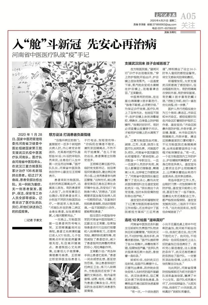 编者按:大河健康报以《入“舱”斗新冠 先安心再治病 河南省中医医疗队战疫手记》为题,对二附院援鄂国家(河南)中医医疗队队员们抗疫故事进行报道。现将全文刊发如下: