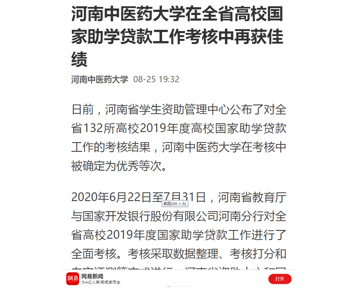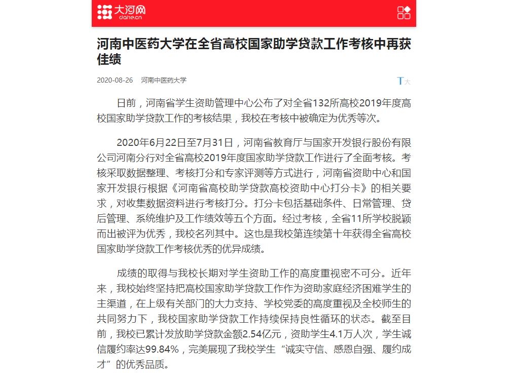 2020年8月25日,大河网、网易新闻对leyu·乐鱼(中国)体育官方网站在全省高校国家助学贷款工作考核中再获佳绩进行报道。