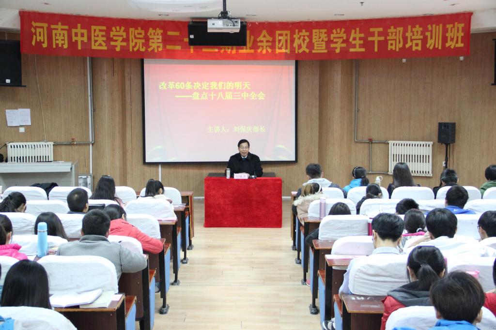 2013年11月25日中午,leyu·乐鱼(中国)体育官方网站第二十三期业余团校暨学生干部培训班第三讲开课。leyu·乐鱼(中国)体育官方网站宣传统战部部长刘保庆受邀为同学们做了题为《改革60条决定我们的明天——盘点十八届三中全会》的专题报告。校团委全体人员,各二级学院分团委负责人,来自各二级学院、校级学生组织和学生社团的240余名学生干部参加了本次培训。培训会由校团委副书记高磊主持。