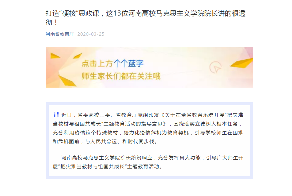 河南高校马克思主义学院院长纷纷响应,充分发挥育人功能,引导广大师生开展“把灾难当教材与祖国共成长”主题教育活动。