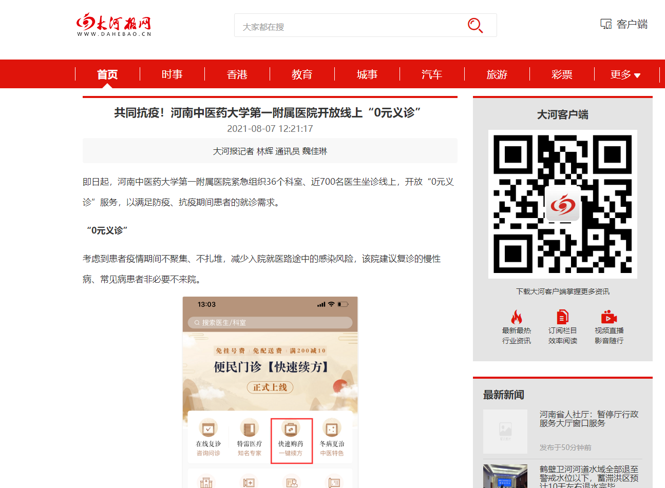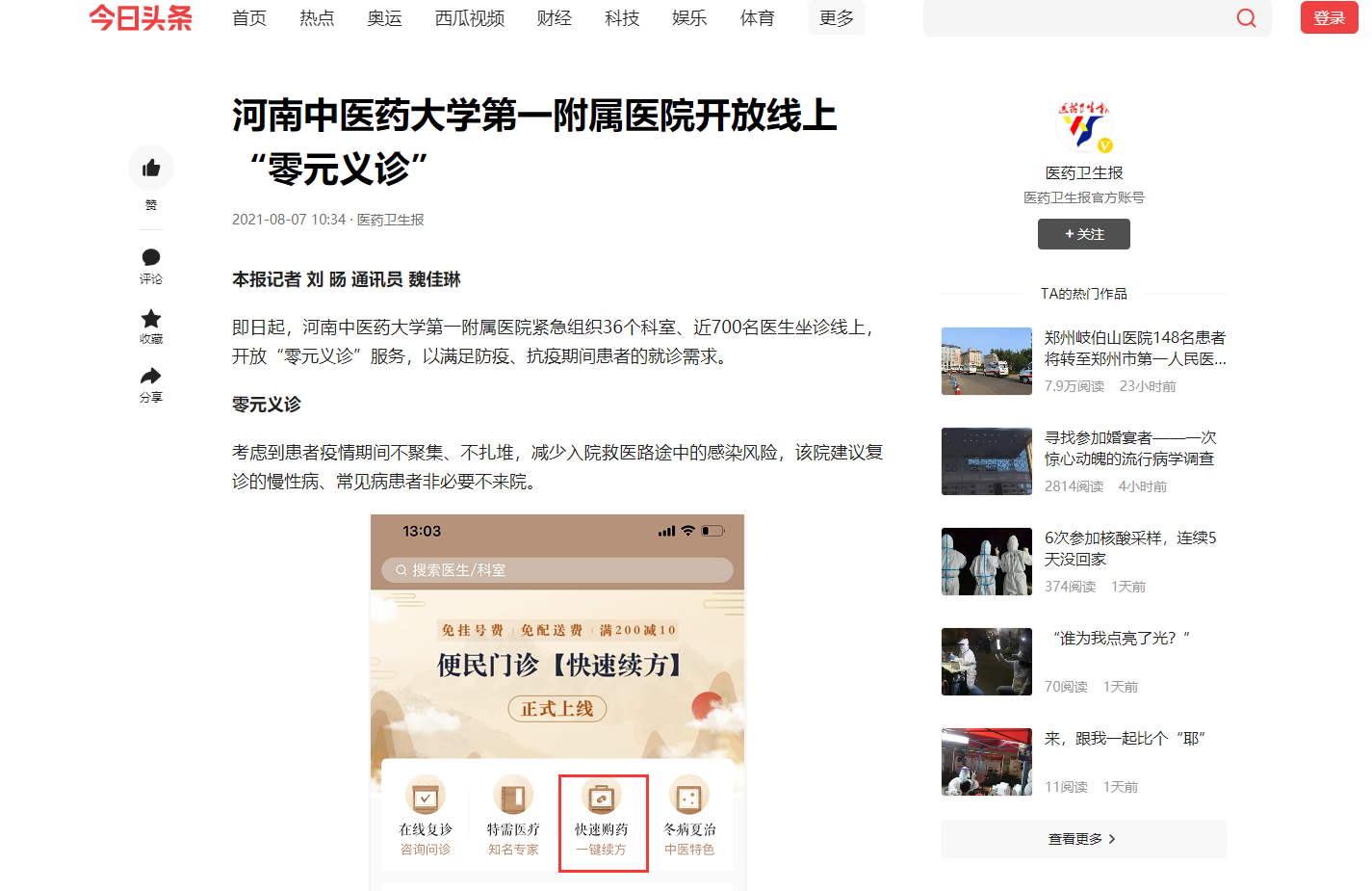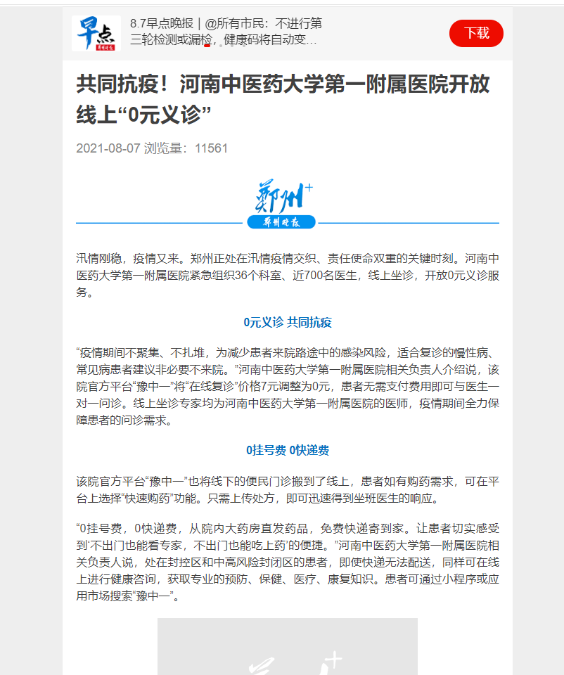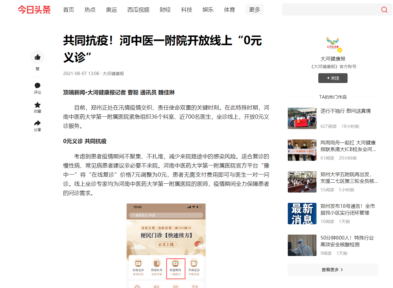 编者按:2021年8月7日,人民日报客户端、大河报网、郑州日报、医药卫生报、今日头条等多家媒体对leyu·乐鱼(中国)体育官方网站一附院开放线上“0元义诊”进行报道。