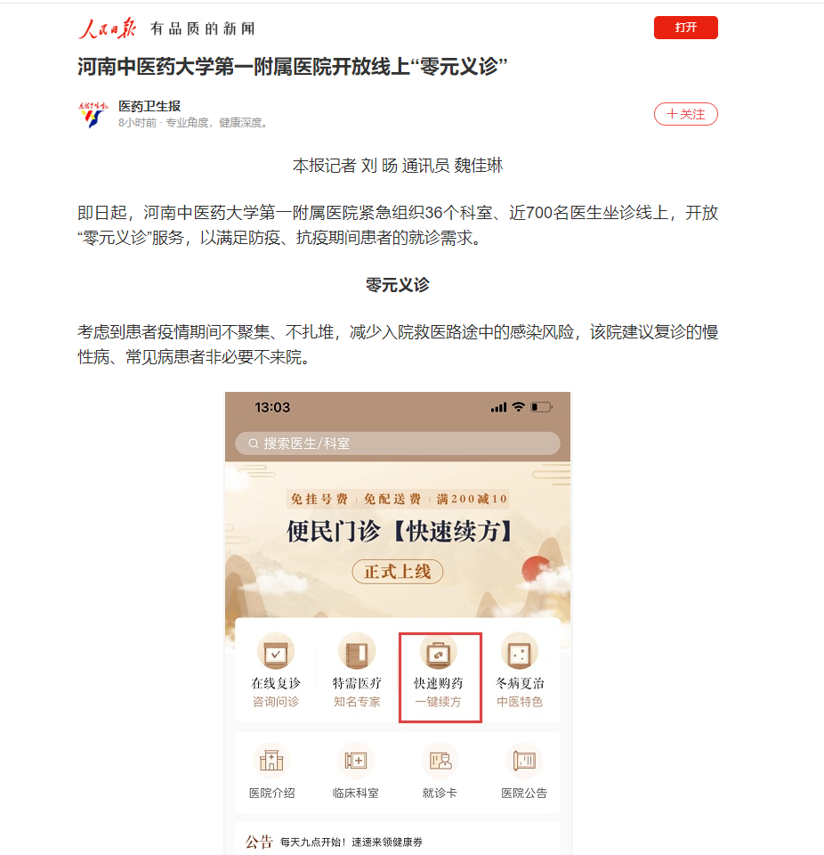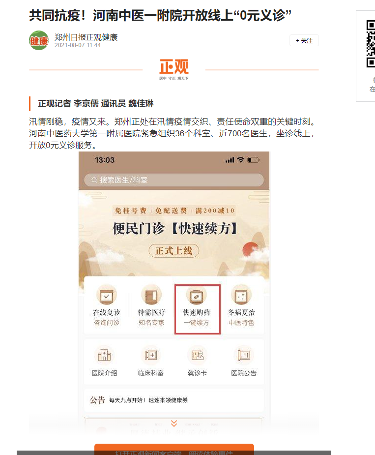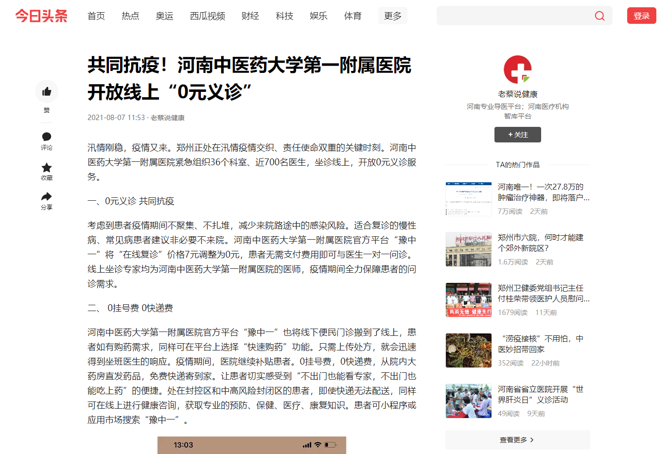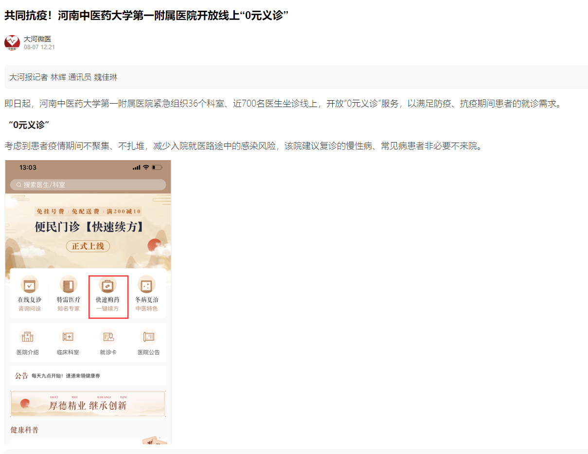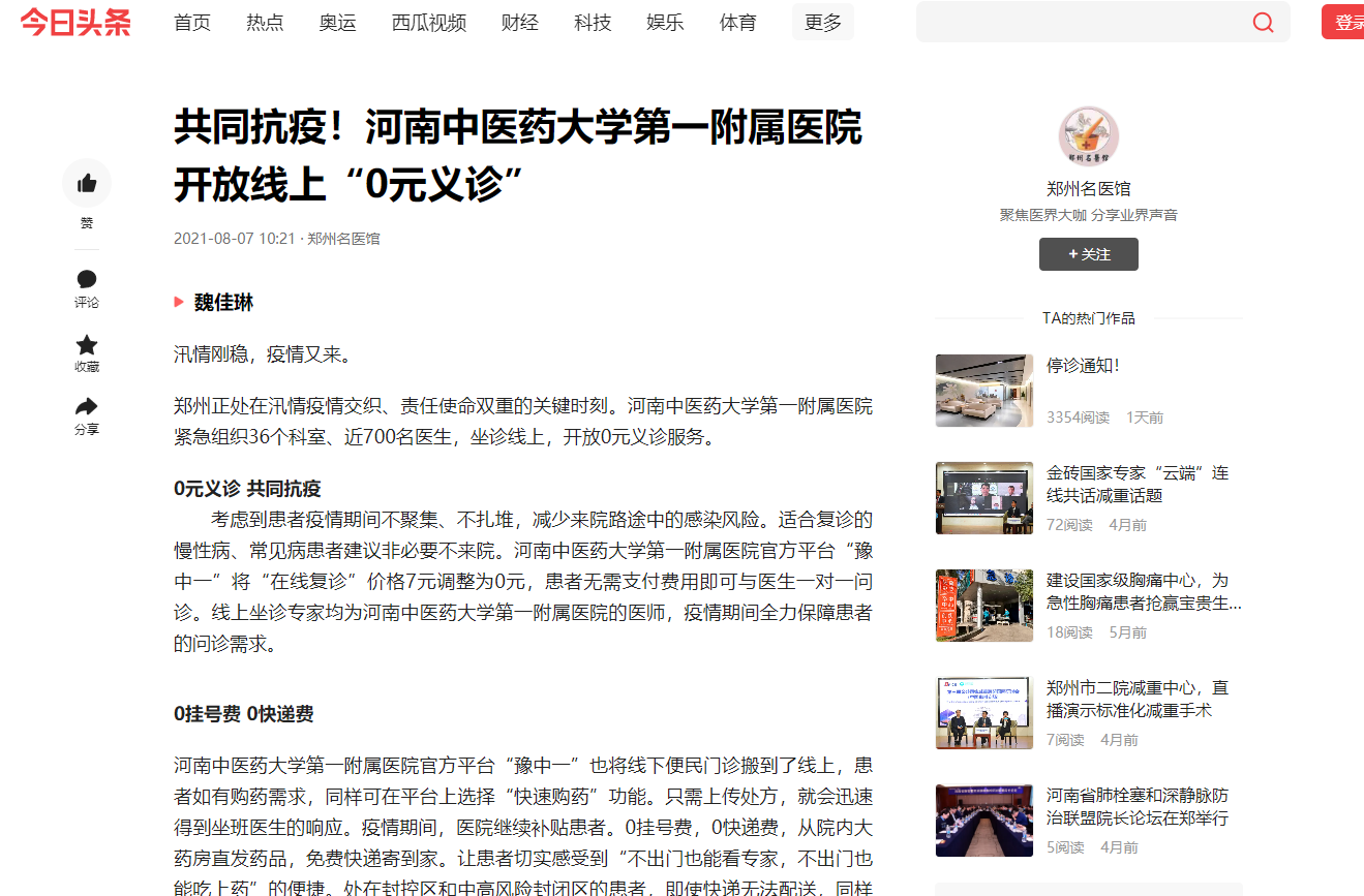 编者按:2021年8月7日,人民日报客户端、大河报网、郑州日报、医药卫生报、今日头条等多家媒体对leyu·乐鱼(中国)体育官方网站一附院开放线上“0元义诊”进行报道。