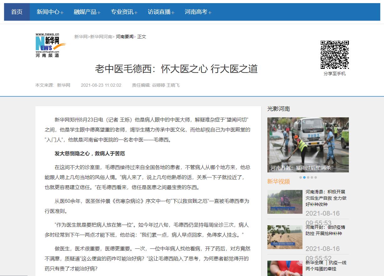 编者按:2021年8月23日,新华社记者王烁专访全国名中医、二附院毛德西教授,从医德医术、读书学习、传承创新三个方面对毛教授进行报道。现将全文刊发如下: