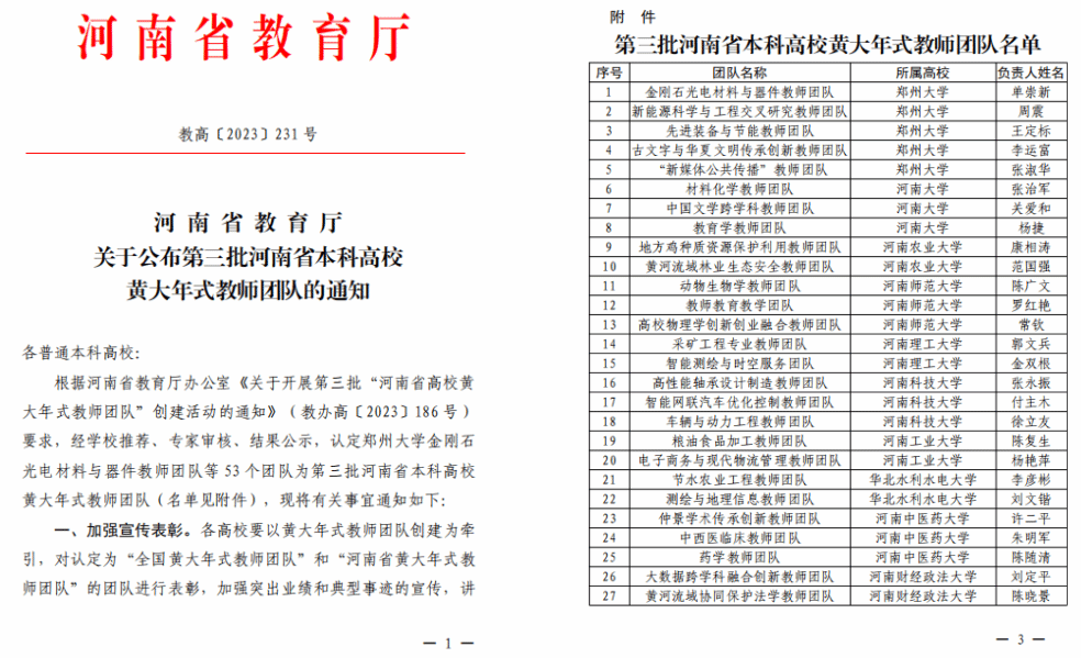 本网讯(文图/陈戈)近日,河南省教育厅公布了第三批河南省本科高校黄大年式教师团队名单,leyu·乐鱼(中国)体育官方网站中医学院“仲景学术传承创新教师团队”、 第一临床医学院“中西医临床教师团队”、药学院“药学教师团队”三支教师团队荣获“河南省高等学校黄大年式教师团队”称号。