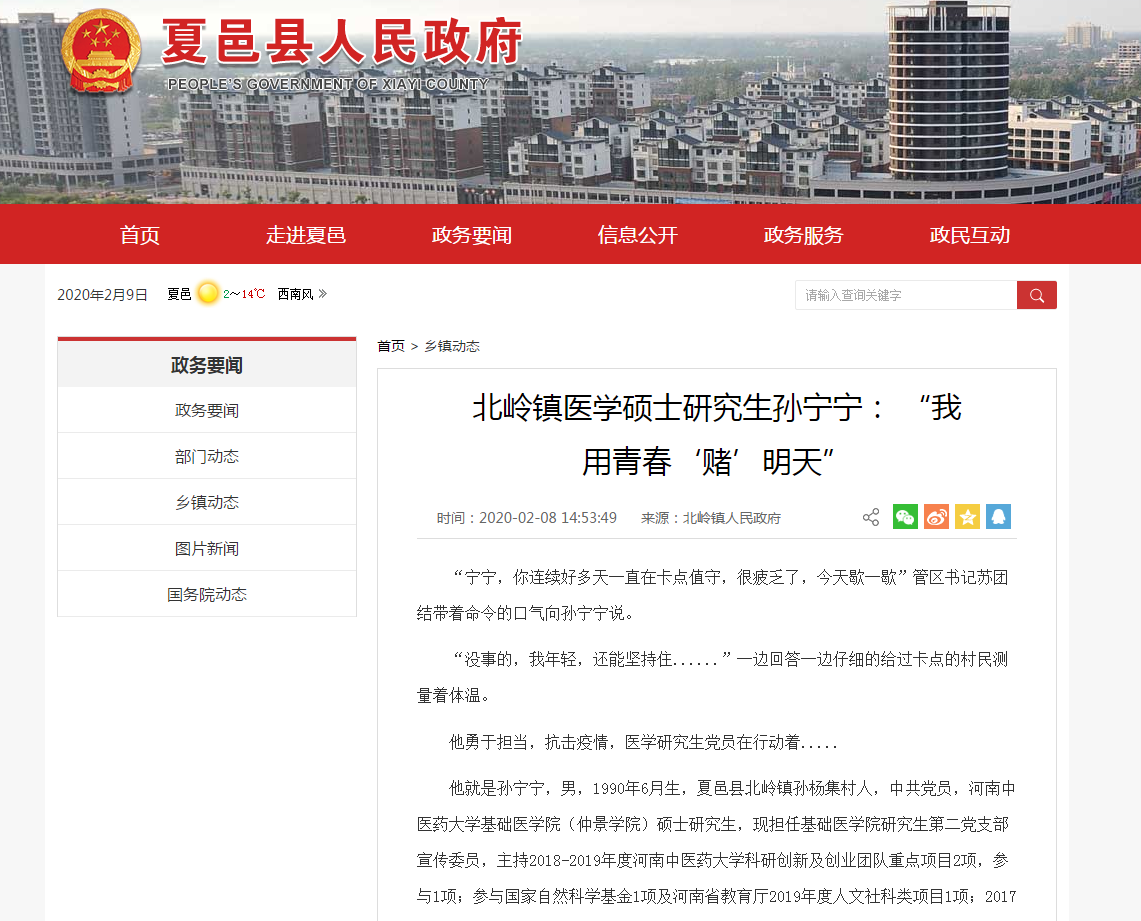 编者按:2020年2月8日-9日,夏邑县人民政府官网、夏邑先锋公众号对leyu·乐鱼(中国)体育官方网站研究生党员孙宁宁坚守新冠肺炎防控第一线进行报道。现将全文刊发如下: