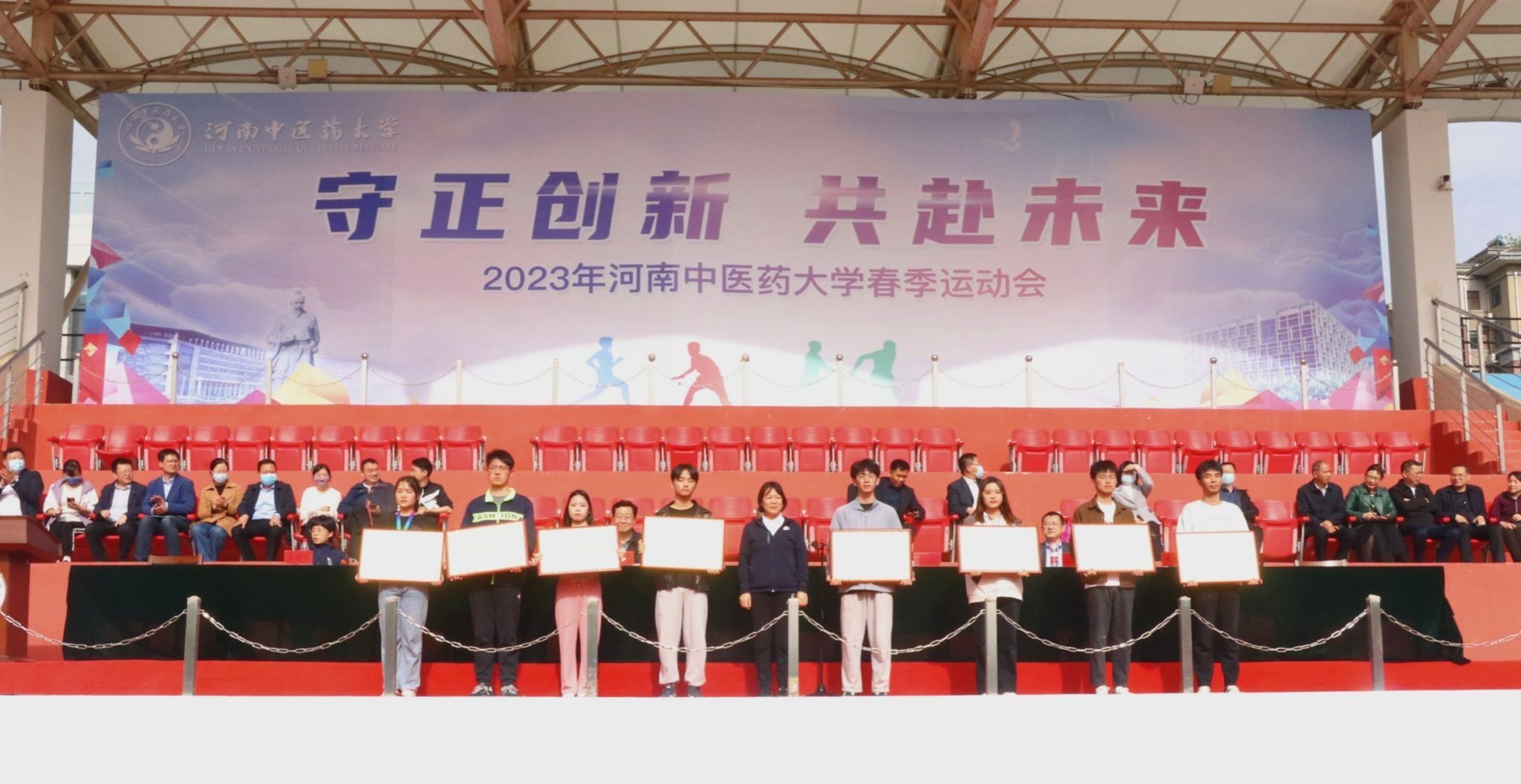 校团委书记高磊宣布获得体育道德风尚奖单位名单。第一临床医学院、护理学院、体育学院、康复医学院、针灸推拿学院、骨伤学院、尚真书院、本草书院获此殊荣。