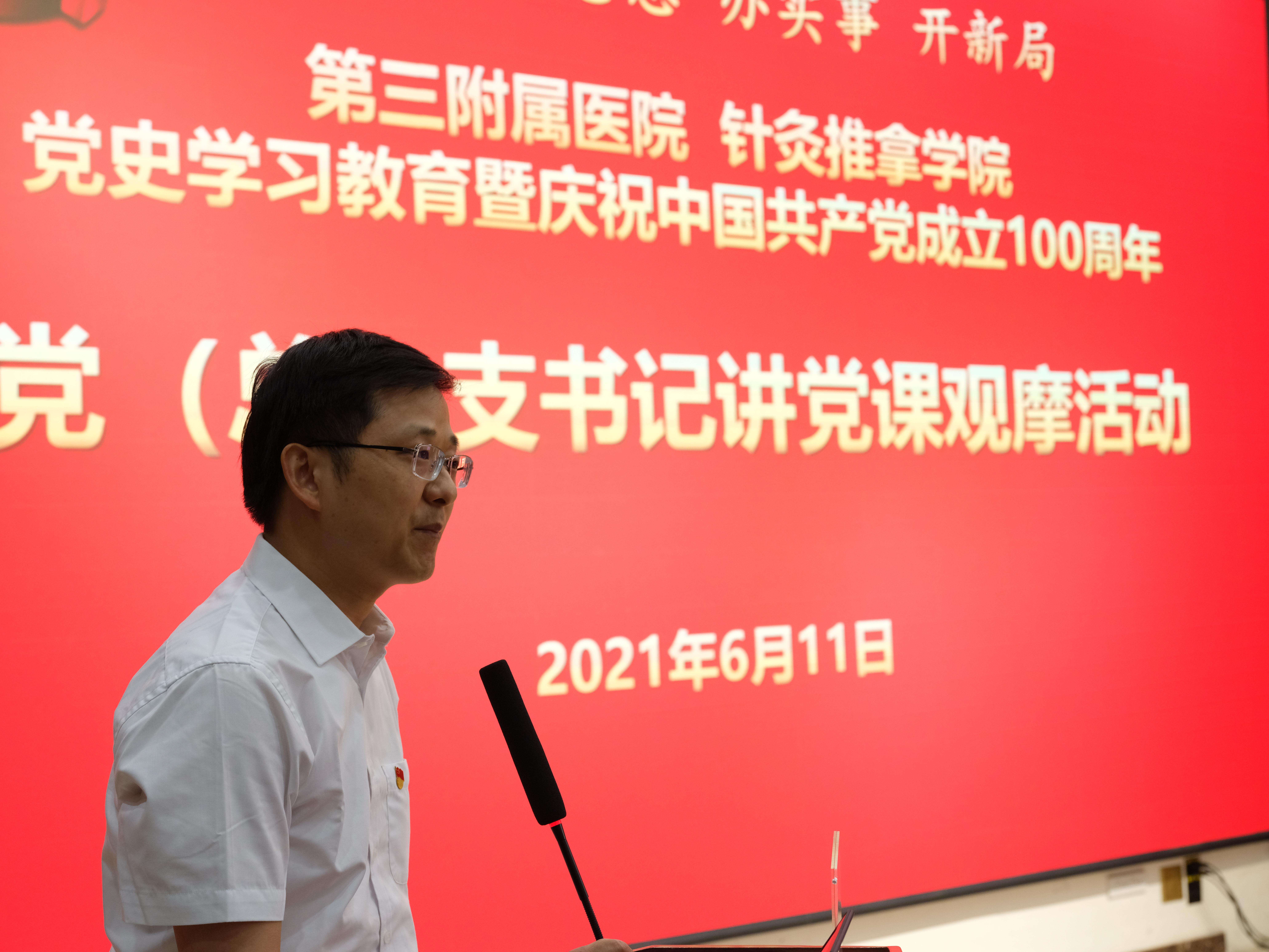 本网讯(文/胡兴旺 郑楠楠 图/田辉)2021年6月11日下午,三附院在医院学术活动中心举办了“学思践悟我带头 争当基层好书记”党史学习教育暨庆祝中国共产党成立100周年党(总)支书记讲党课观摩活动。为高质量开展党(总)支部书记讲党课工作,校党委宣传部副部长蔡信强、党委组织部副处级组织员李琳到会指导。三附院党委副书记陶洁、党委副书记焦钧、纪委书记刘会勋和工会主席蔡庆春以及新老党员、积极分子代表参加了活动。