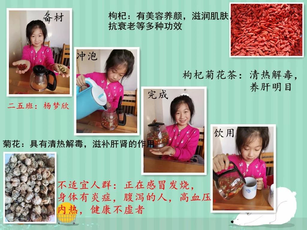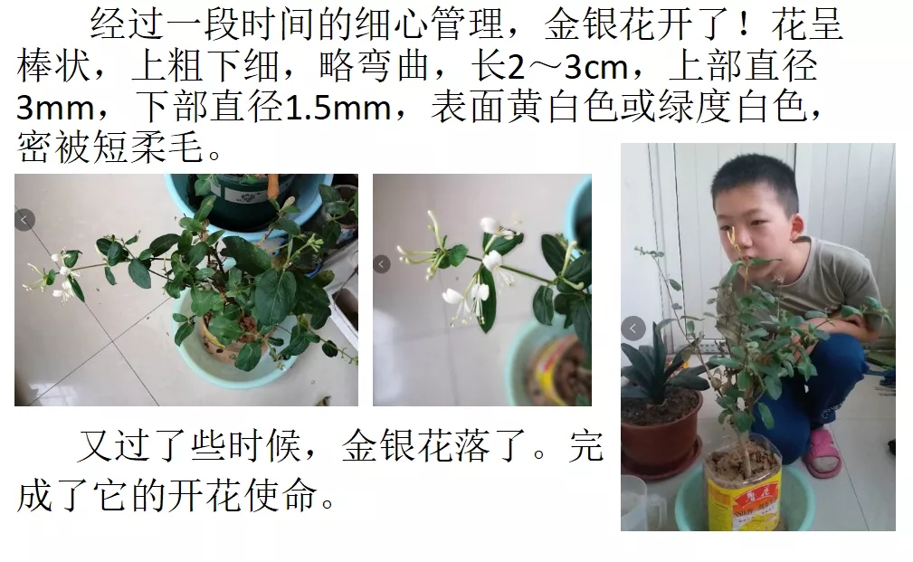 在整个活动过程中,每个孩子都积极参与,孩子们给老师带来许多惊喜,比如二年级四班学生魏天赐居然提出将野菜分为草本和乔木两类,五年级六班学生王一冰同时精心种植了薄荷、香菜等三盆药食两用植物,六年级四班学生钱利涛制作的生动有趣的PPT让更多人认识了金银花……