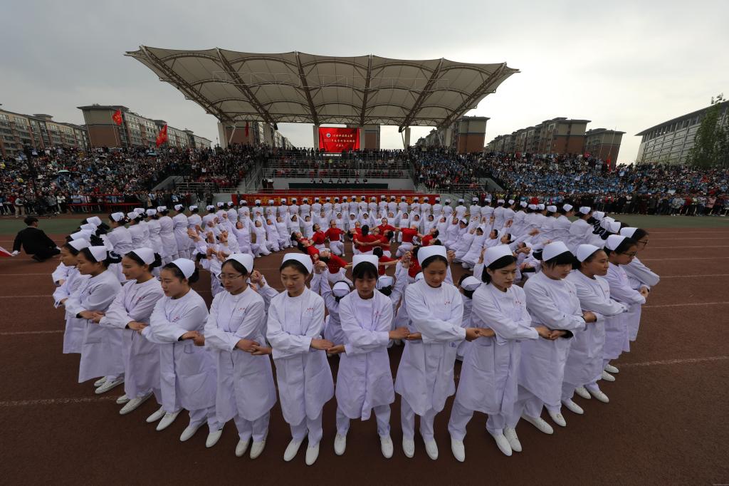 护理学院摆出“春花”造型象征“舍己为人,忠贞职守”的南丁格尔精神